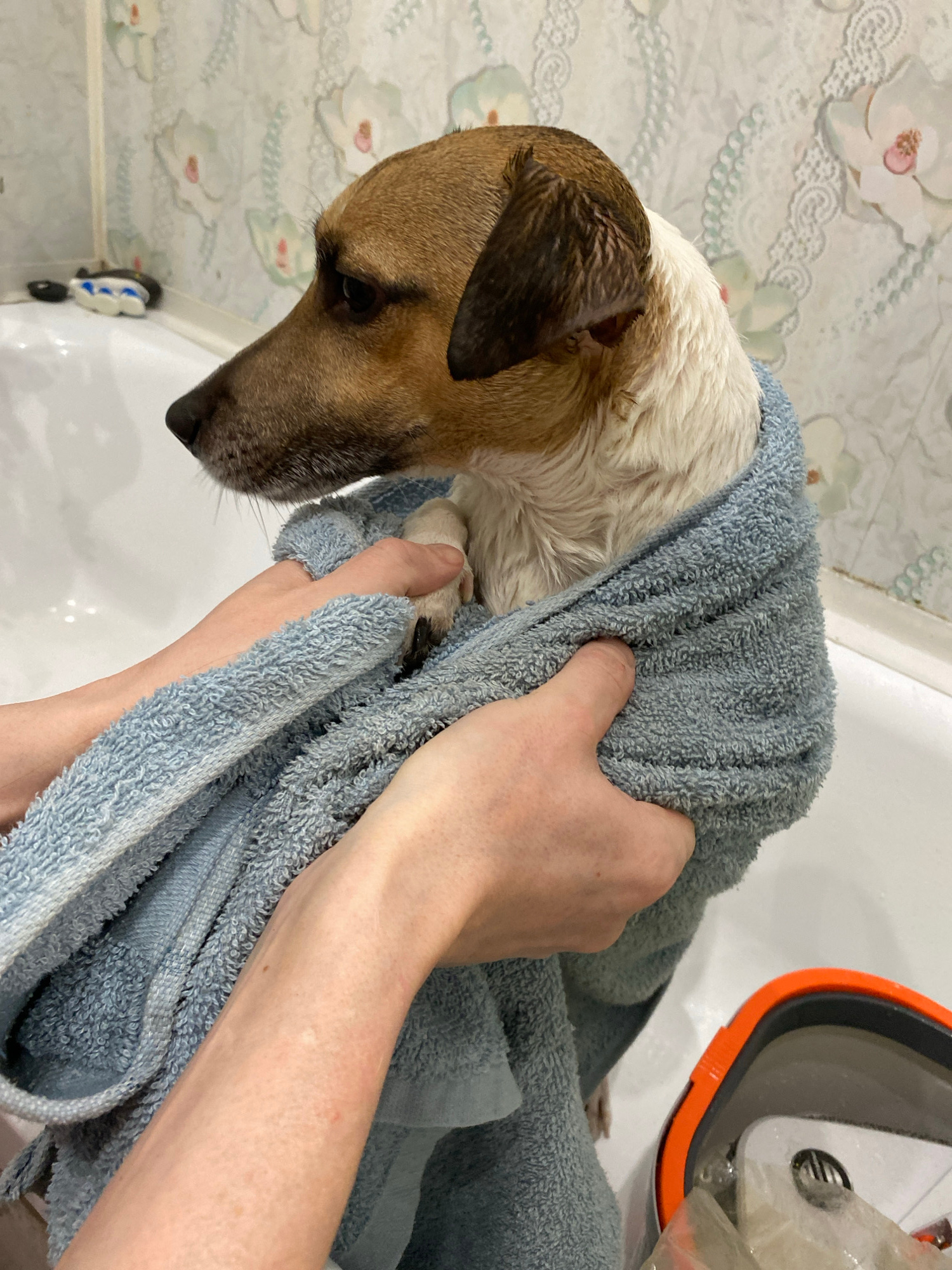 A medium, indoor shot depicts a dog being dried with a light blue towel. The dog has a brown head, white fur on its neck and body, and is being held and dried by a person with pale skin and visible ar…read more