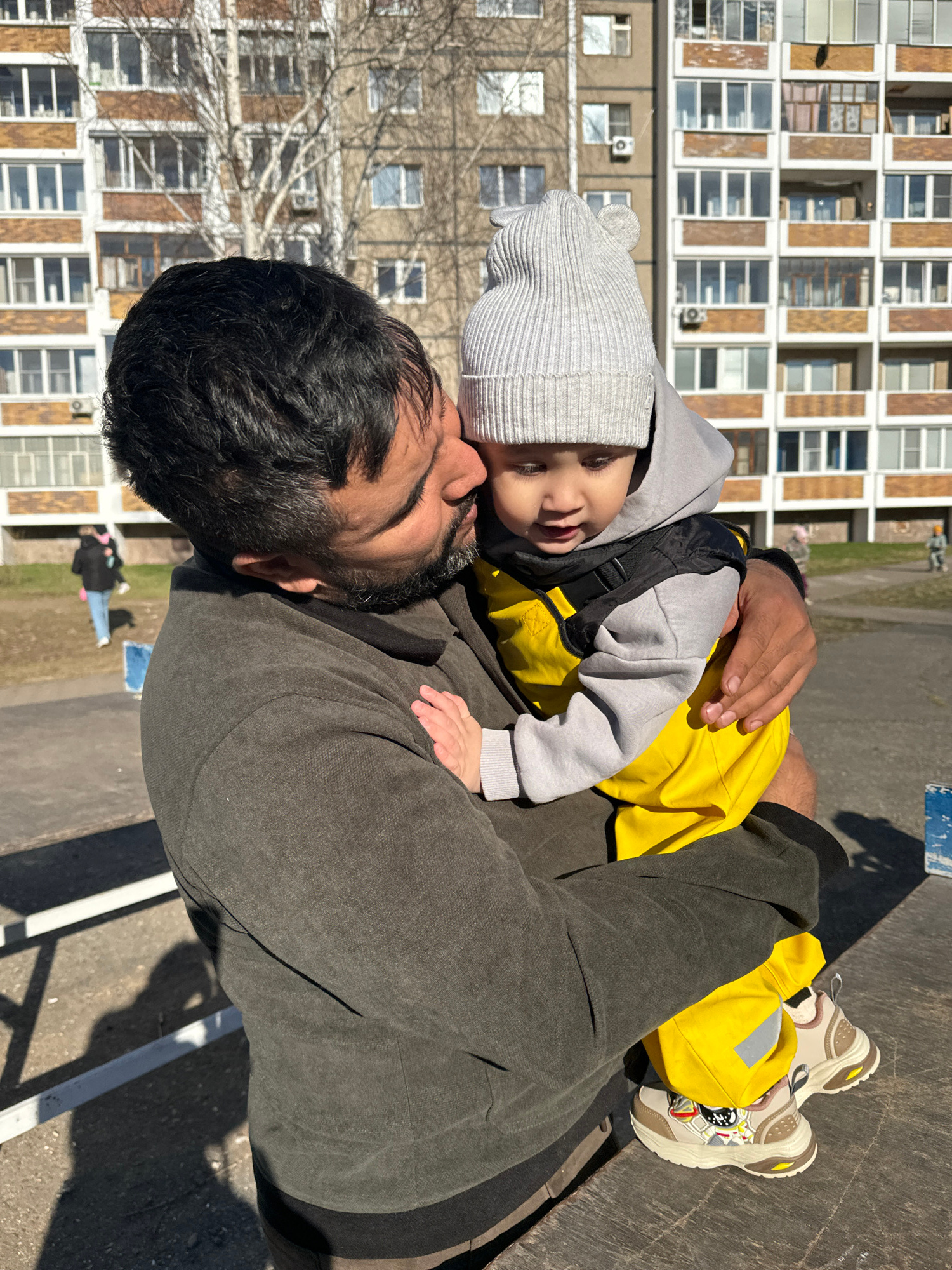 The image captures a father holding his young child, likely in Chaikovsky, Russia, given the Soviet-era apartment building in the background. The father, a man with dark hair and a beard, is wearing a…read more