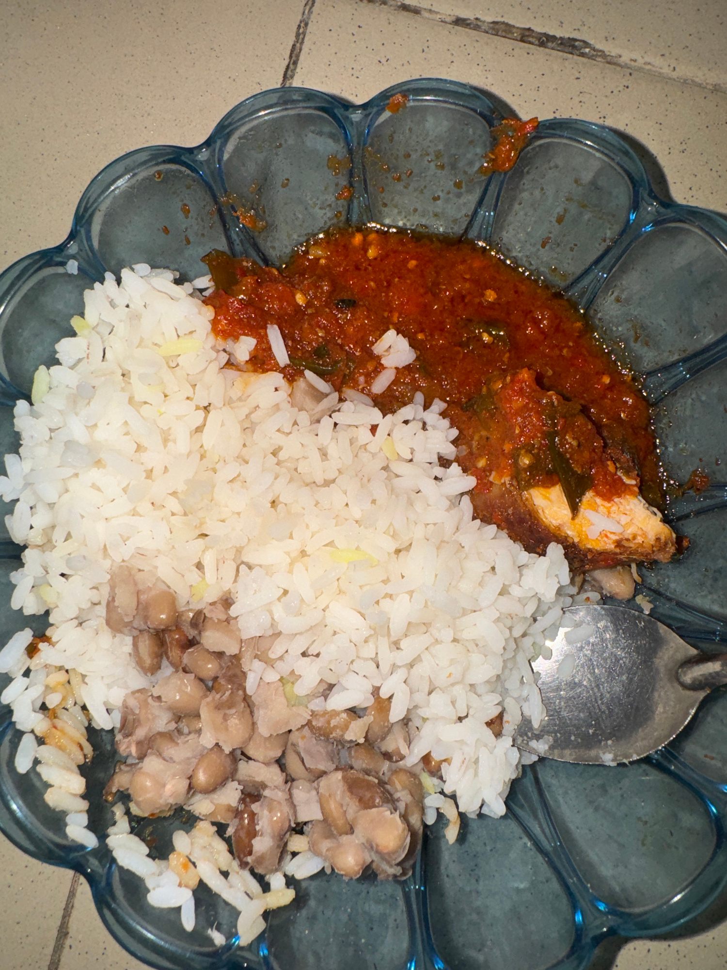 A plate of food is placed on a surface. The plate is blue with a decorative, scalloped edge. The food consists of a portion of rice, beans, and a reddish sauce with what appears to be fish. A silver s…read more