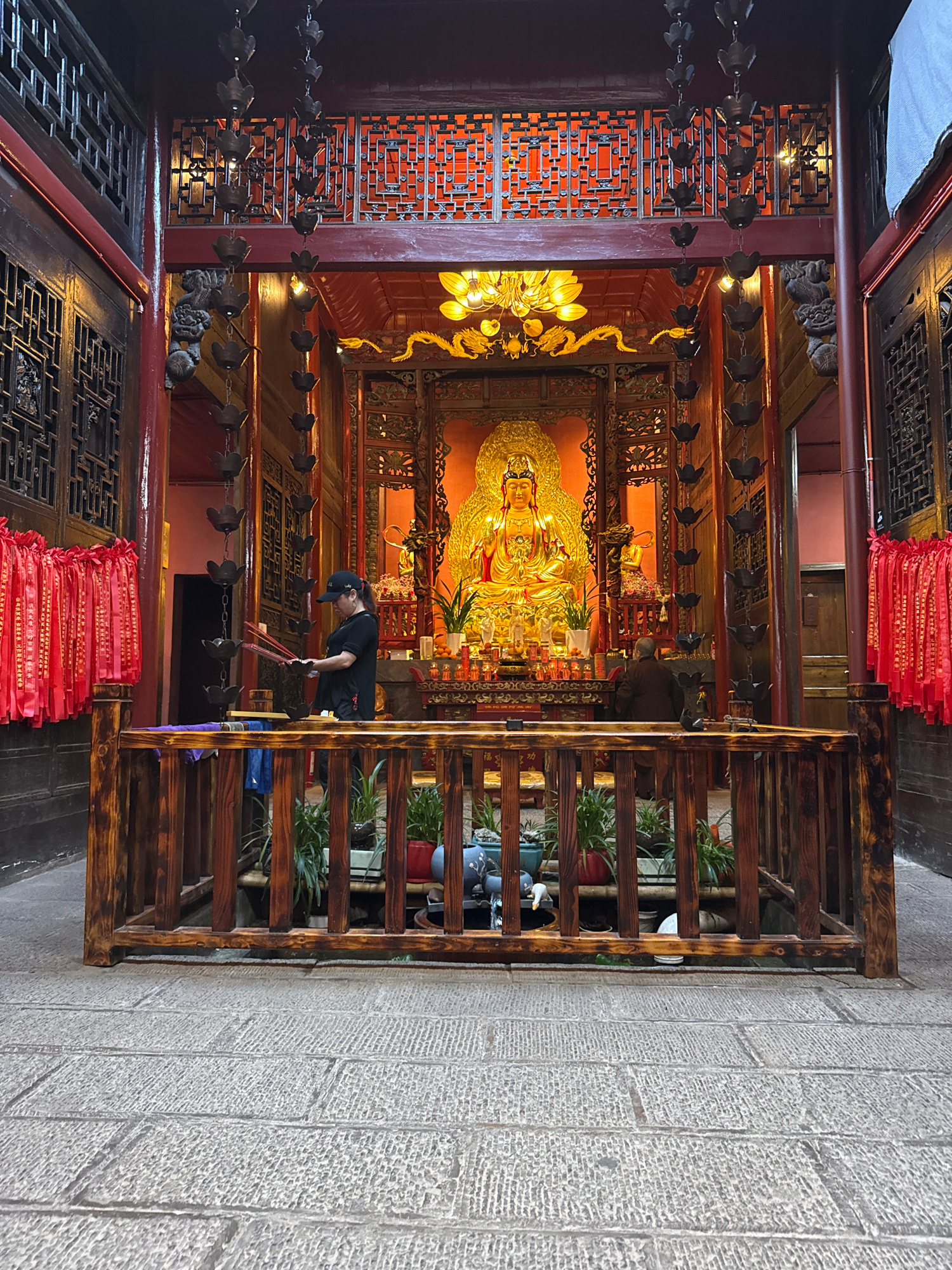 The image captures a scene at Furong Ancient Town in Xiangxi Tujia and Miao Autonomous Prefecture, China. A golden Buddha statue is prominently displayed in an ornate, red and gold-toned interior, emb…read more