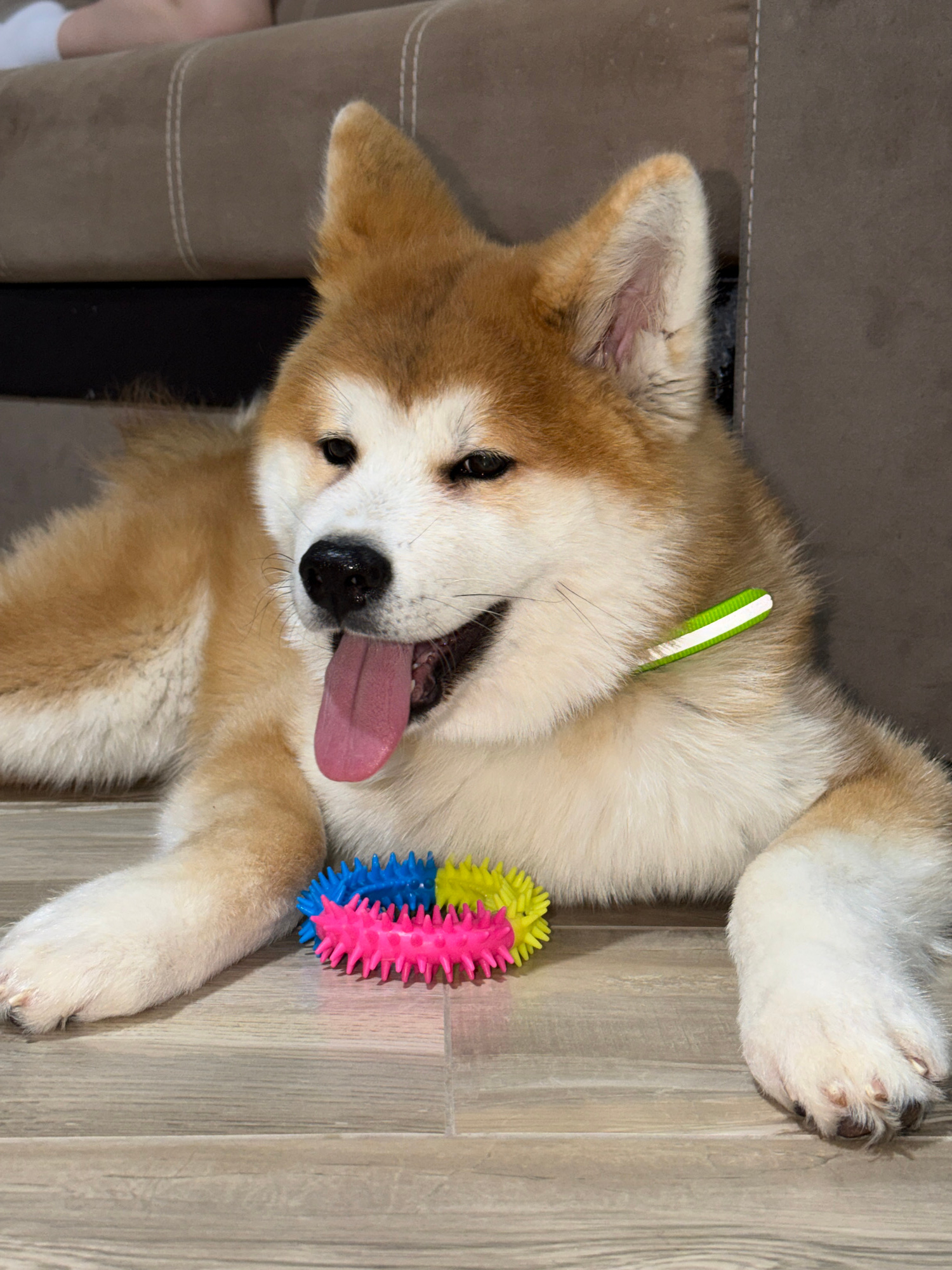 A close-up, angled shot shows an Akita dog lying on its back on a light-colored wooden-look floor. The dog has a predominantly white and tan coat. Its pink tongue is lolling out of its mouth. A green…read more
