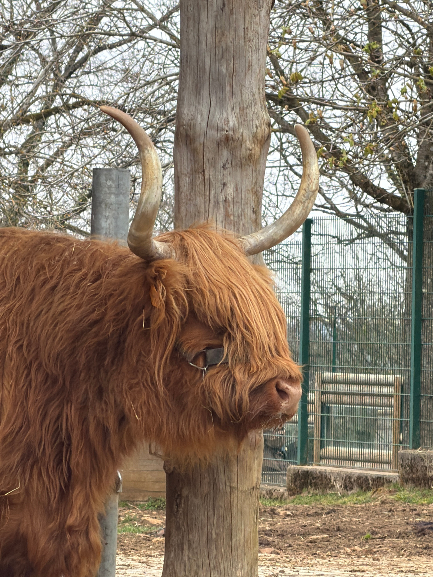 The image shows a reddish-brown Highland cattle resting its head on a wooden fence. The cattle has long, shaggy hair covering most of its face, with one eye visible. Its horns curve upwards and outwar…read more