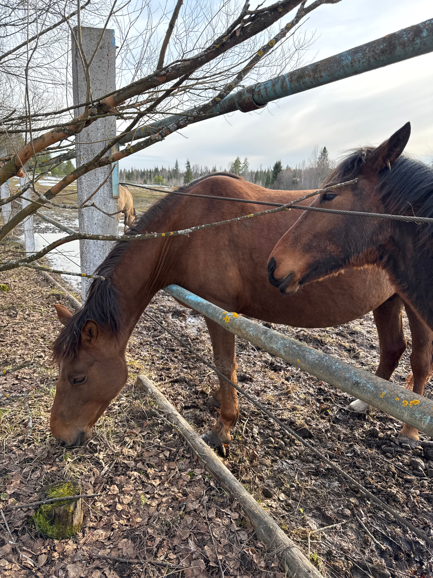 Two brown horses are visible in a muddy enclosure. One horse has its head down near the ground, while the other stands behind it. A metal fence surrounds the enclosure. Leafless trees are in the backg…read more