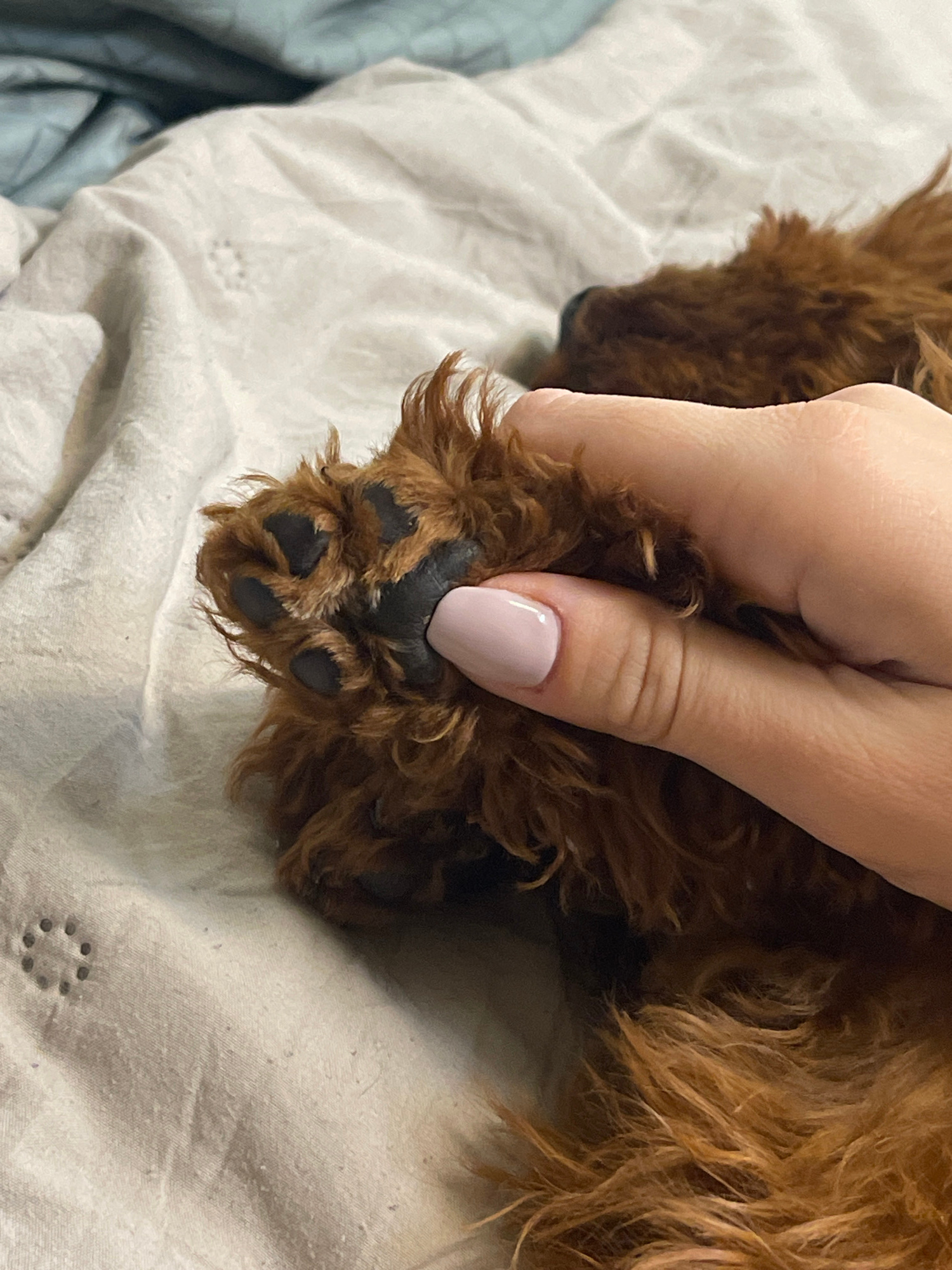 This close-up image portrays a tender moment between a human and a small, fluffy, brown dog, set indoors in what appears to be a cozy domestic environment, possibly in Sofia, Bulgaria. A person's hand…read more