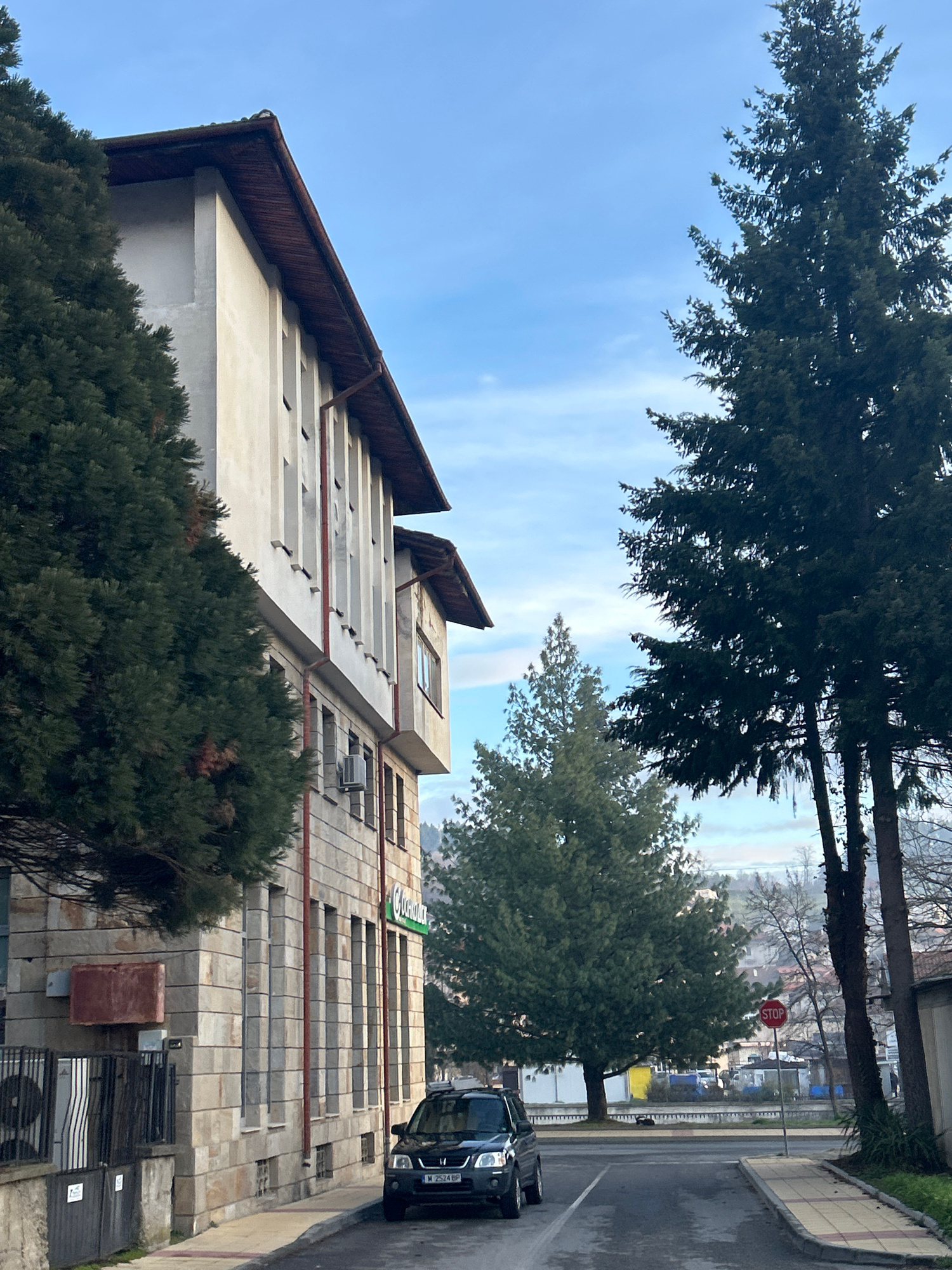 The image presents a view of a building in Zlatograd, Bulgaria. The building is multi-storied, with a light-colored facade constructed of stone blocks. It is decorated with a brown-trimmed roof. There…read more