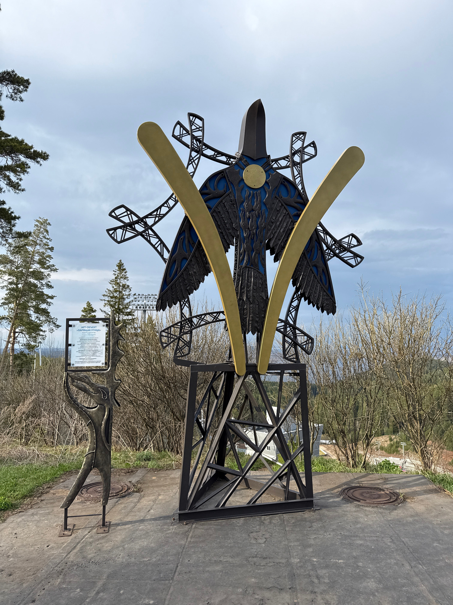 The image shows an outdoor art installation in Прикамский, Russia. The central element is a stylized sculpture of a bird with outstretched wings, constructed from black metal and accented with blue an…read more