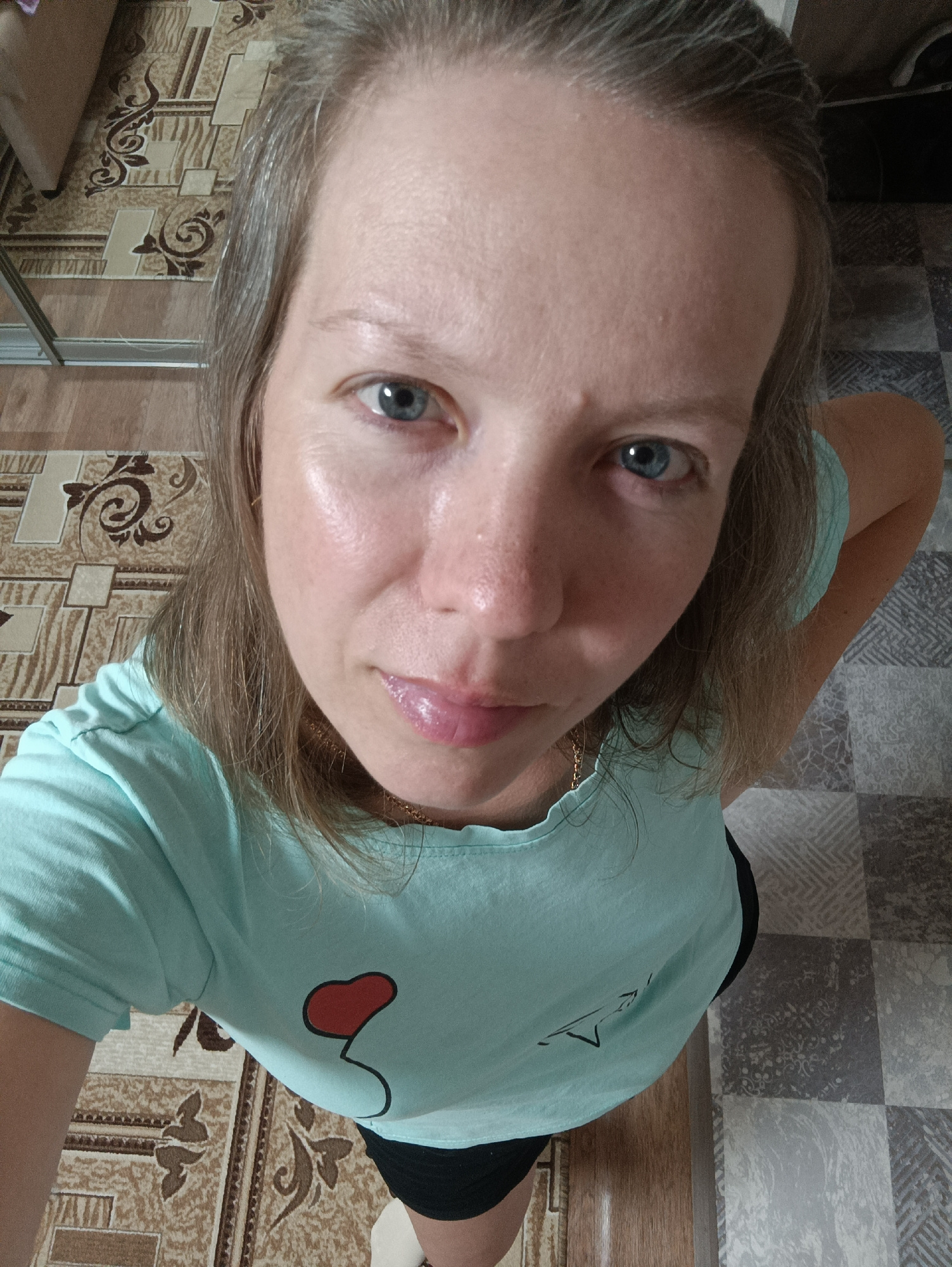A middle-aged woman with fair skin, blue eyes, and light brown/graying hair is taking a selfie from a high-angle perspective indoors. She is wearing a light blue t-shirt with a red heart-shaped balloo…read more