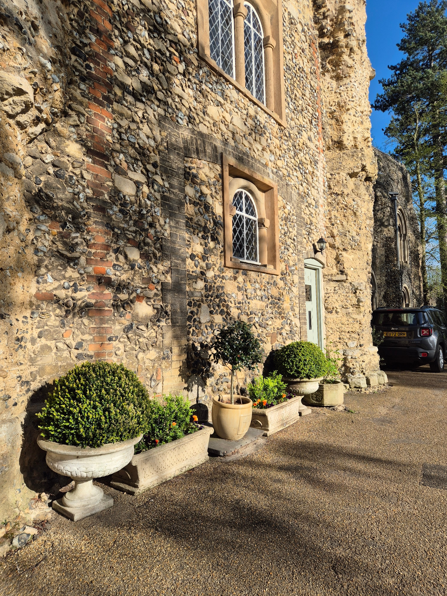 The image captures a scene in West Suffolk, United Kingdom. A weathered building is the focal point, constructed from a mix of brick, flint, and stone, with two arched windows and a door. The building…read more
