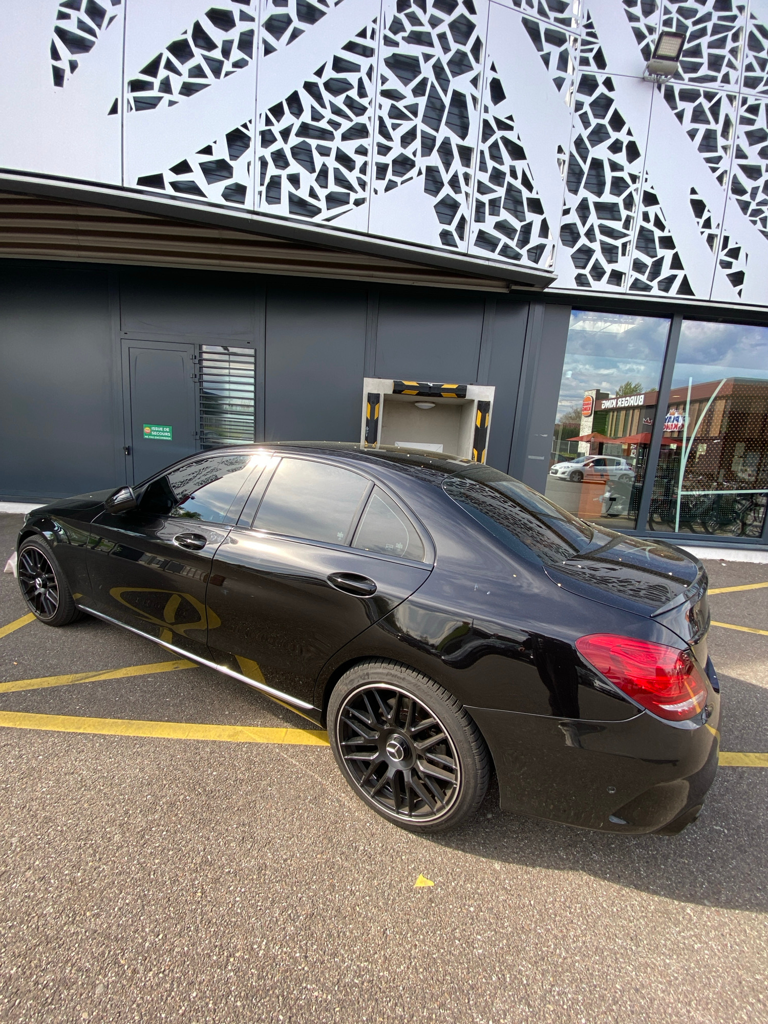 A black sedan-type car is parked in a designated spot marked by yellow lines in Hœnheim, France. The car is located next to a building with modern architectural features, including a perforated metal…read more
