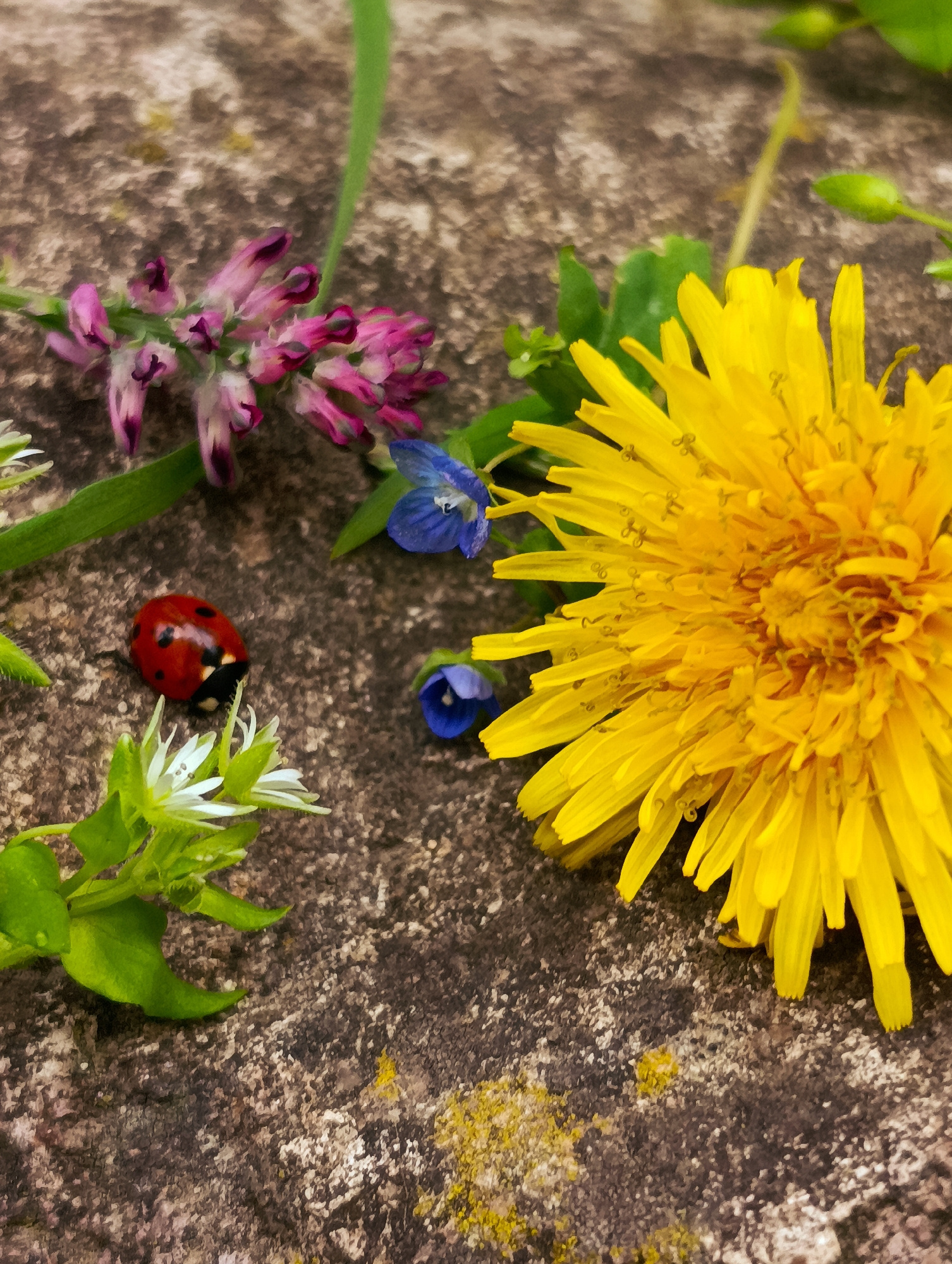 A high-angle shot displays a textured concrete surface strewn with wildflowers and a ladybug. The setting is unidentified, but the prompt mentions Kardzhali, Bulgaria. A vibrant yellow dandelion dominβ¦read more