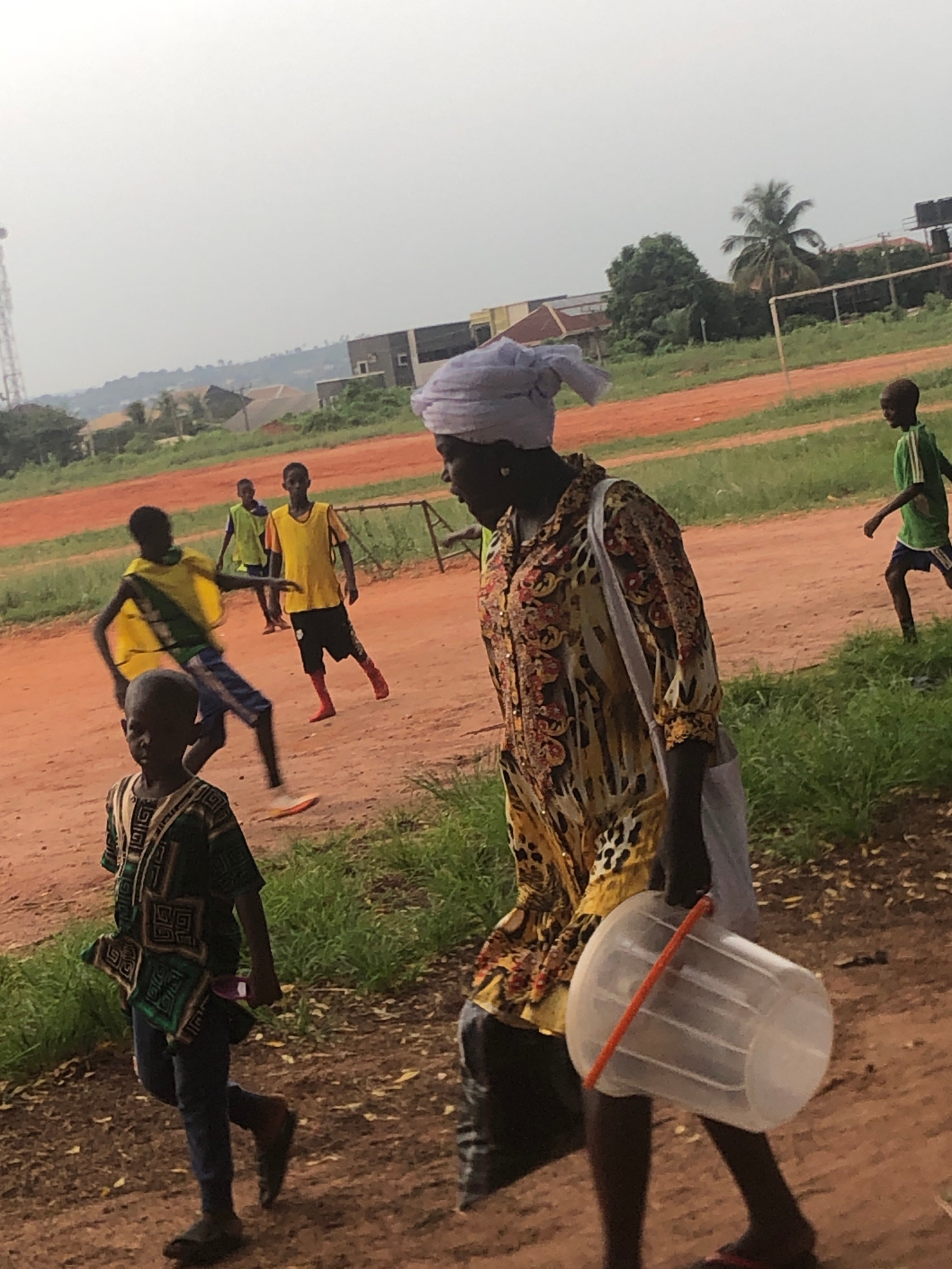 On a dirt field in Ukwu-Abwa, Nigeria, several people are present. An adult wearing a white head covering and a colorful patterned top carries a clear plastic bucket with an orange handle. Four childr…read more