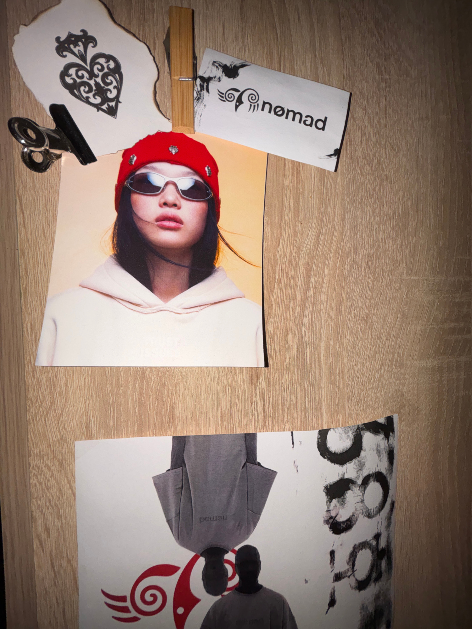 The image presents an overhead view of several papers and objects arranged on a light-colored wooden surface, likely a table or desk, illuminated by indoor lighting. Central to the composition is a p…read more