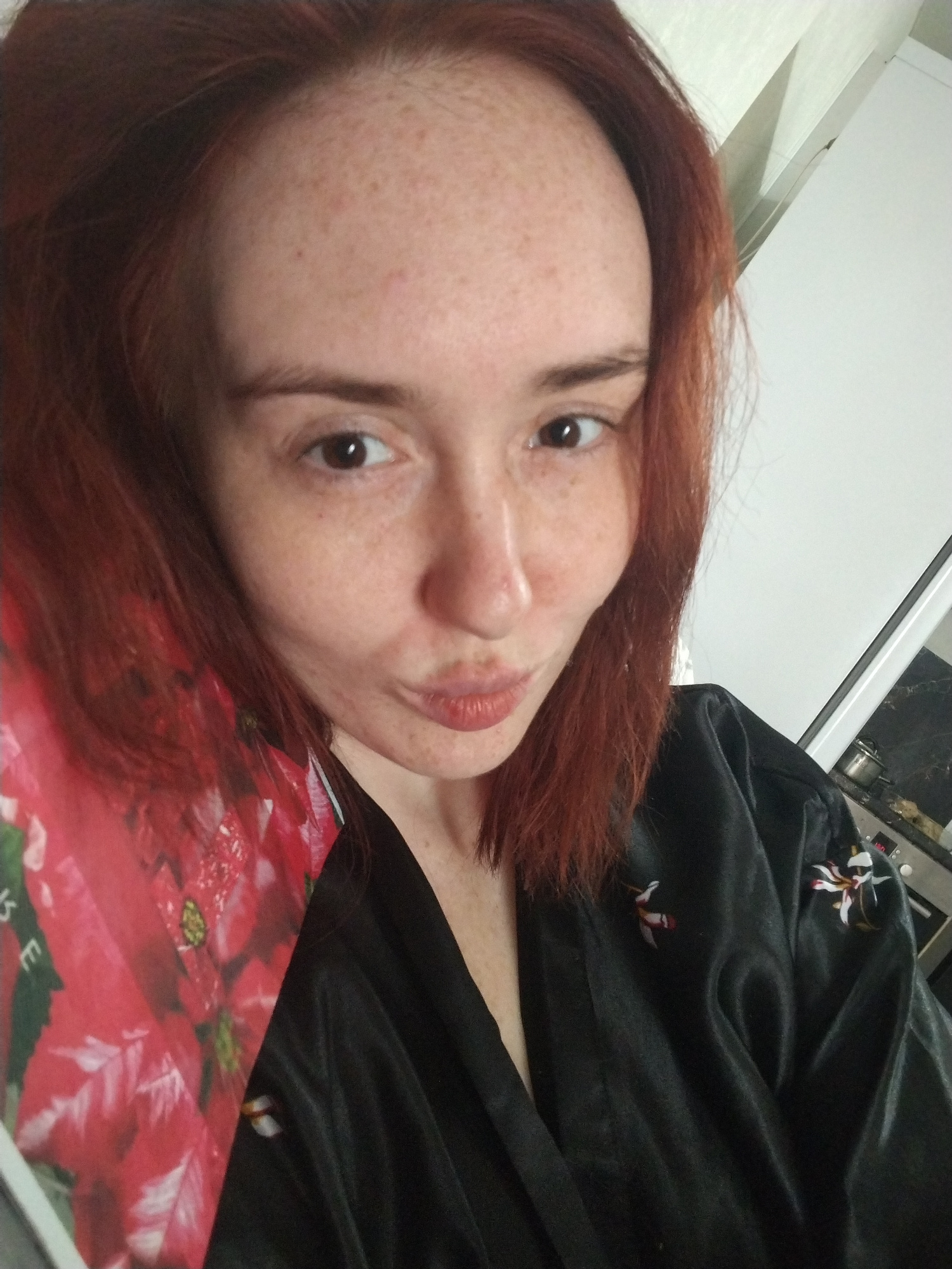 A selfie of a fair-skinned woman with red hair. She has freckles on her forehead and cheeks. She is wearing a black satin robe with white floral embroidery on the shoulder. Her lips are pursed. In theβ¦read more