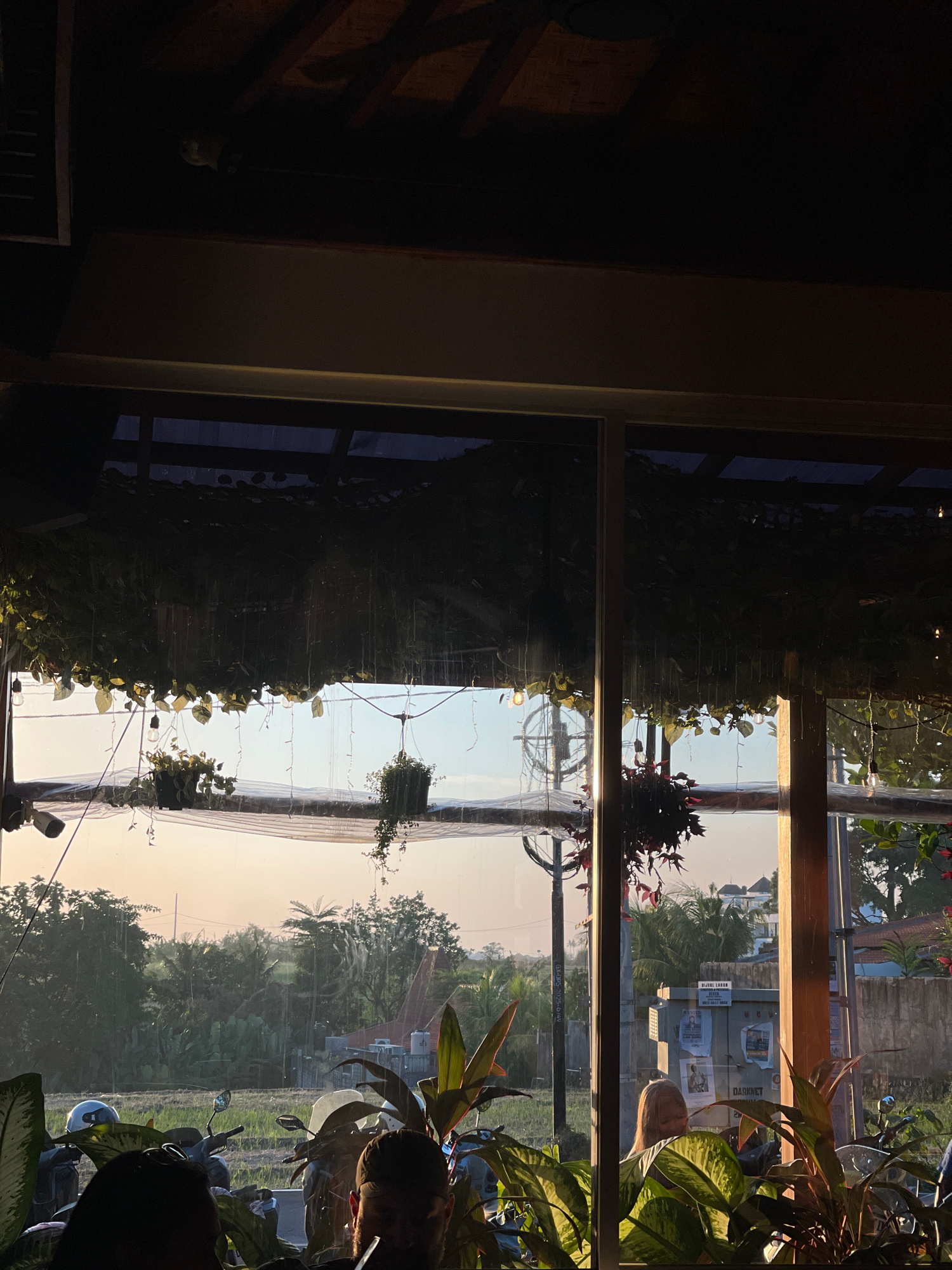 The image captures a view from inside a building, possibly a residence, through a large window. The window is lined with numerous potted plants and hanging vines, partially obscuring the outside view.…read more