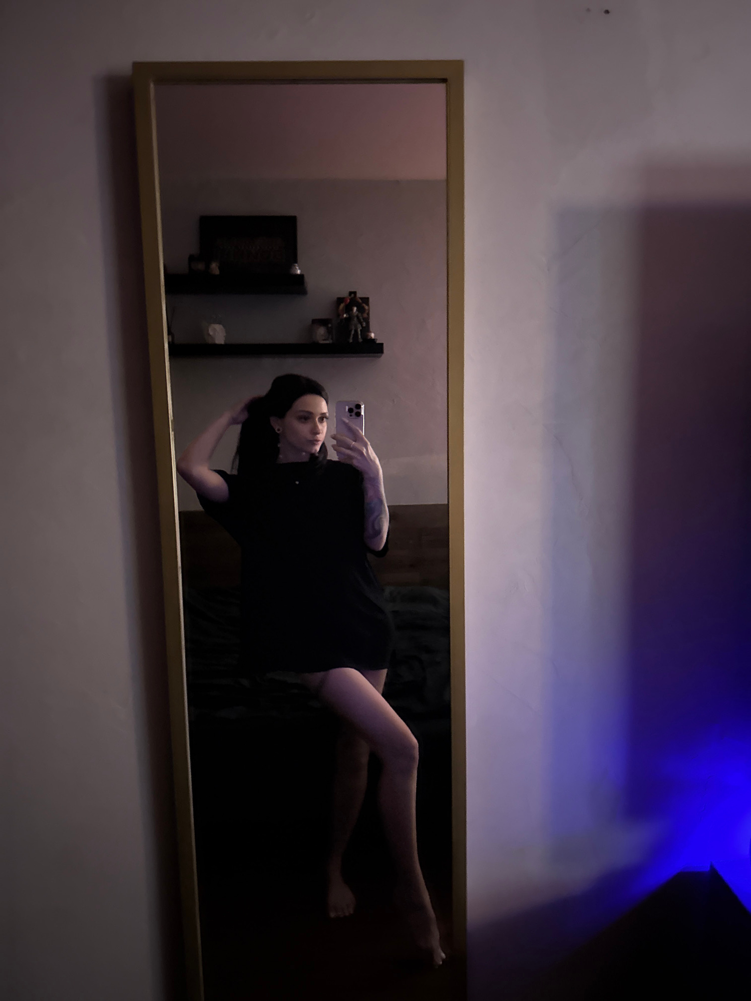A person with long dark hair, wearing a black dress and holding a cell phone, is lying on a dark surface and taking a picture of themselves in a gold-framed mirror. Behind the person in the reflection…read more