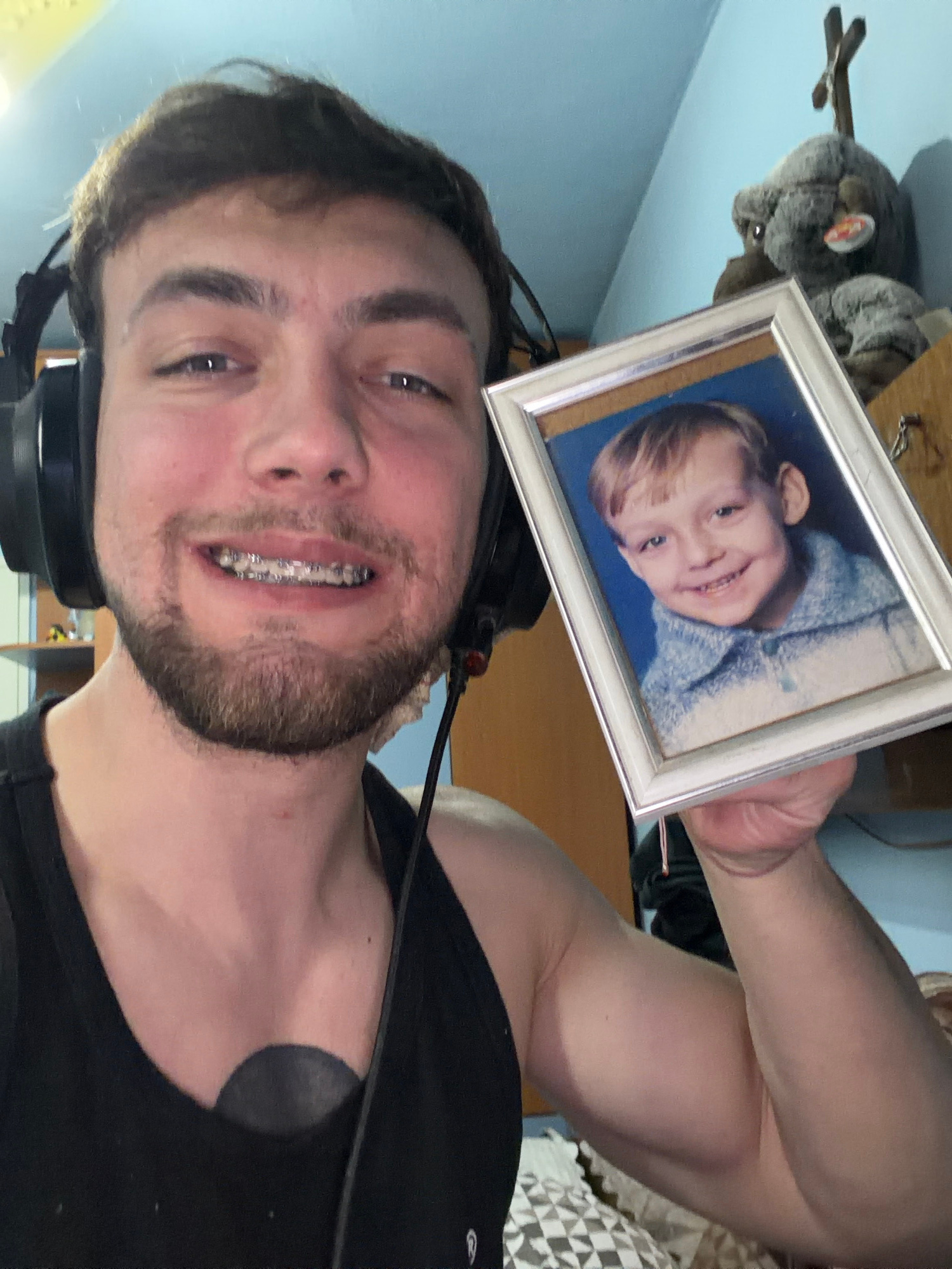 A selfie depicts a man holding a framed photograph of a child. The man has short dark hair, a beard, and is wearing headphones. His teeth show braces. He wears a black tank top and has a dark, circula…read more