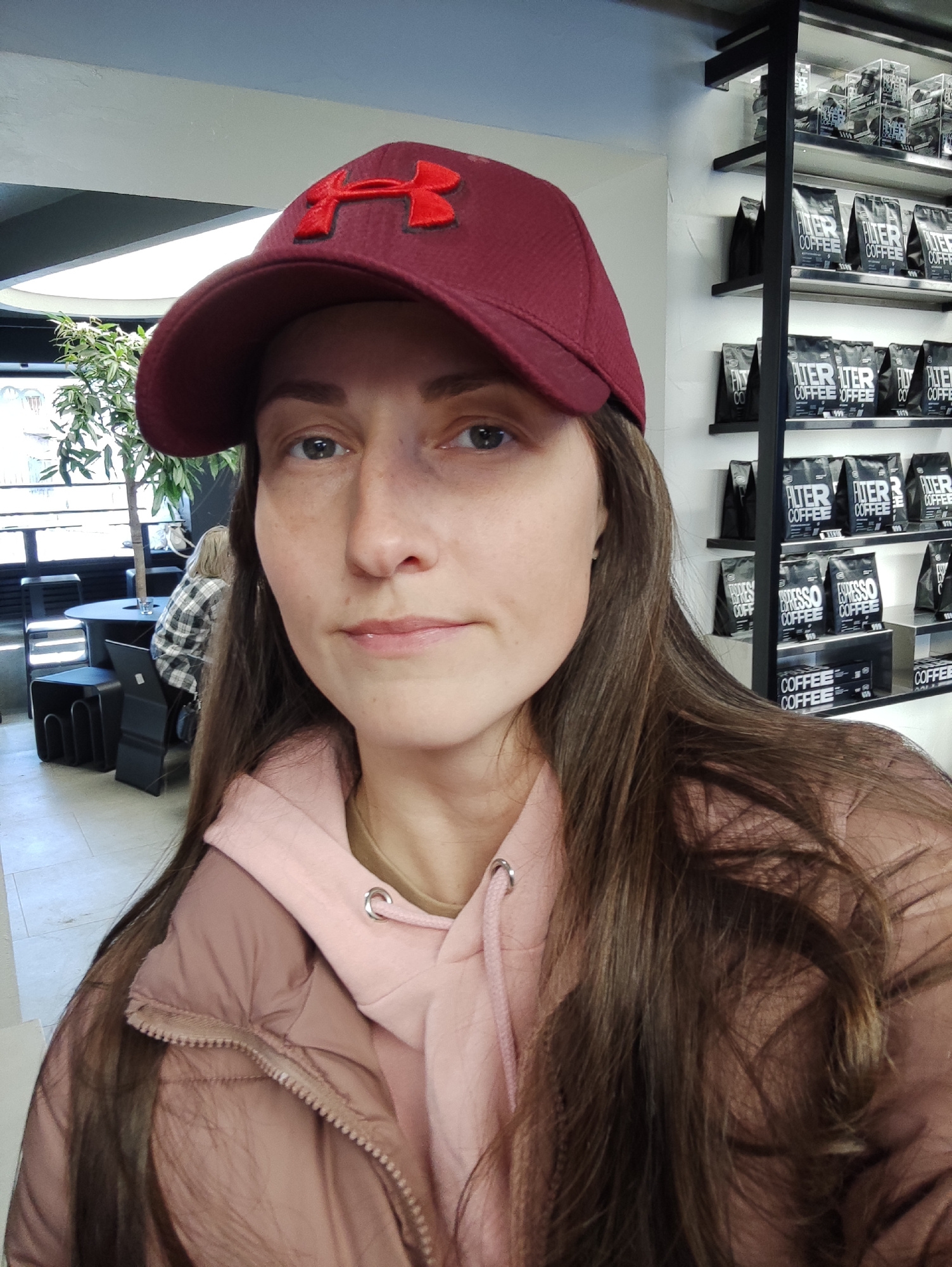 A woman with long brown hair and wearing a maroon Under Armour cap is the primary subject of this selfie-style photograph, taken indoors. She is also wearing a light pink hoodie and a blush-colored pu…read more