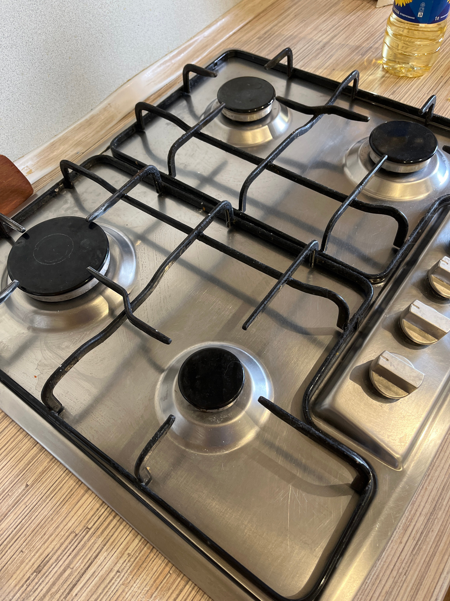 The image displays a close-up, high-angle view of a four-burner gas cooktop integrated into a kitchen counter. The cooktop has a brushed stainless steel surface with black, cast iron grates over each…read more