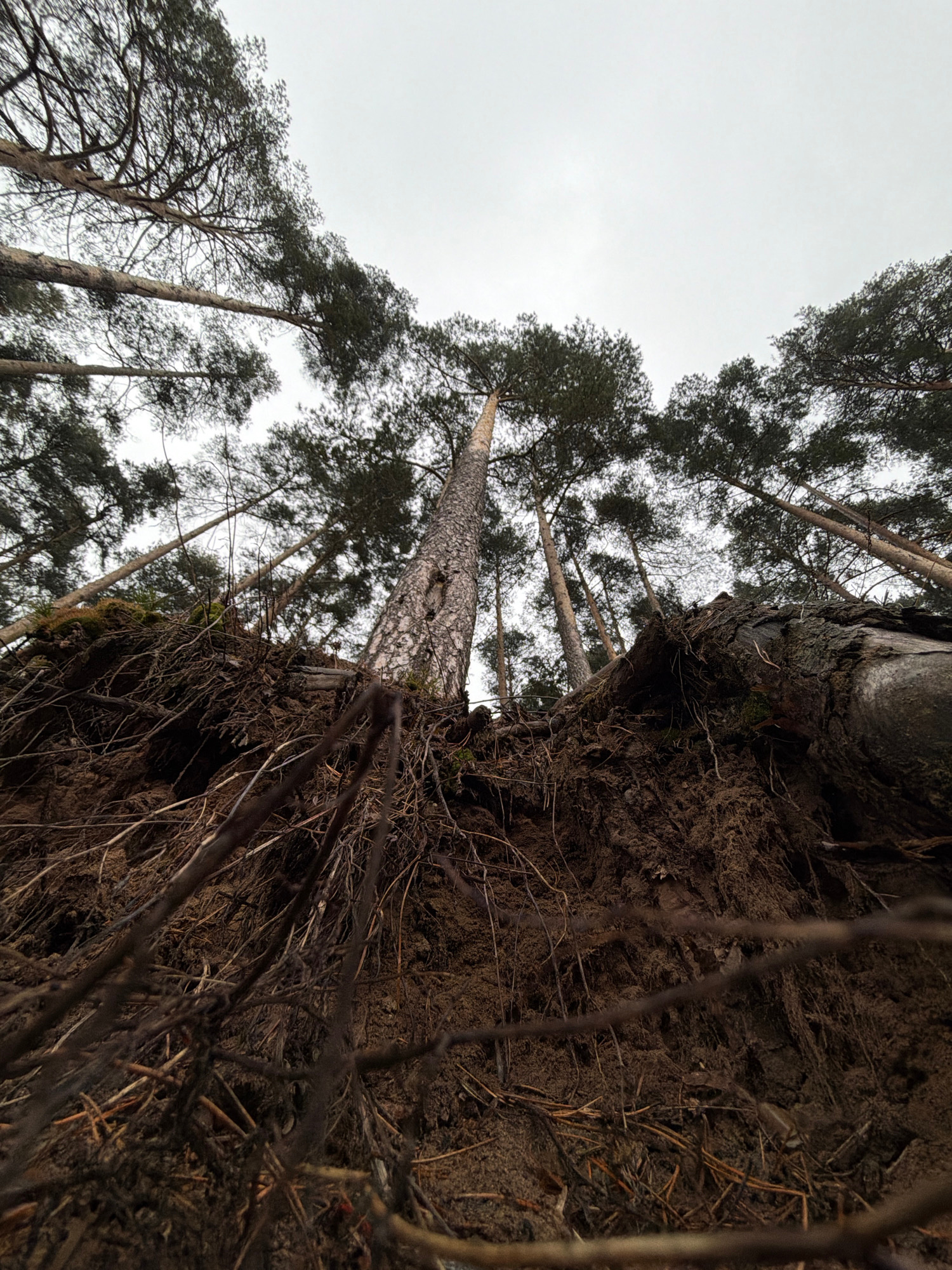 The image shows an upward view into a forest, likely taken on a cloudy day, as the sky is overcast. The vantage point is low to the ground, close to the exposed roots and dirt of an uprooted tree on t…read more