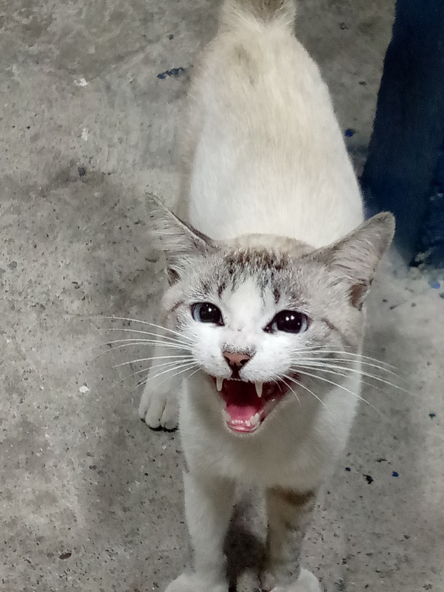 A medium shot shows a light-colored cat with dark markings around its head and ears, standing on a textured, grey surface. The cat is facing the camera with its mouth open, revealing its teeth and pin…read more