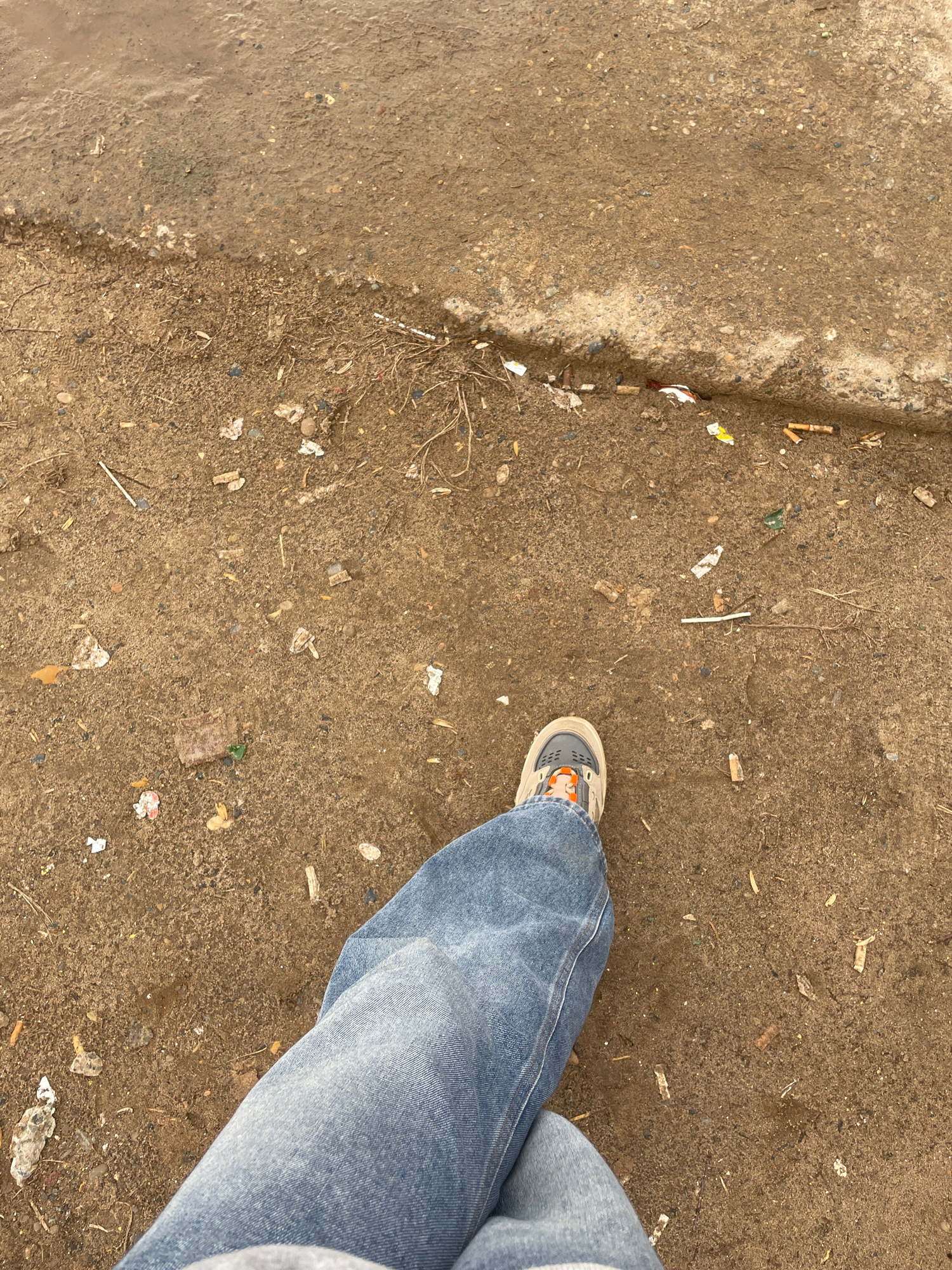 A ground-level shot shows a person standing on a dirty sidewalk in what appears to be a city environment. The sidewalk is composed of brown earth and gravel, with litter scattered across the surface,…read more
