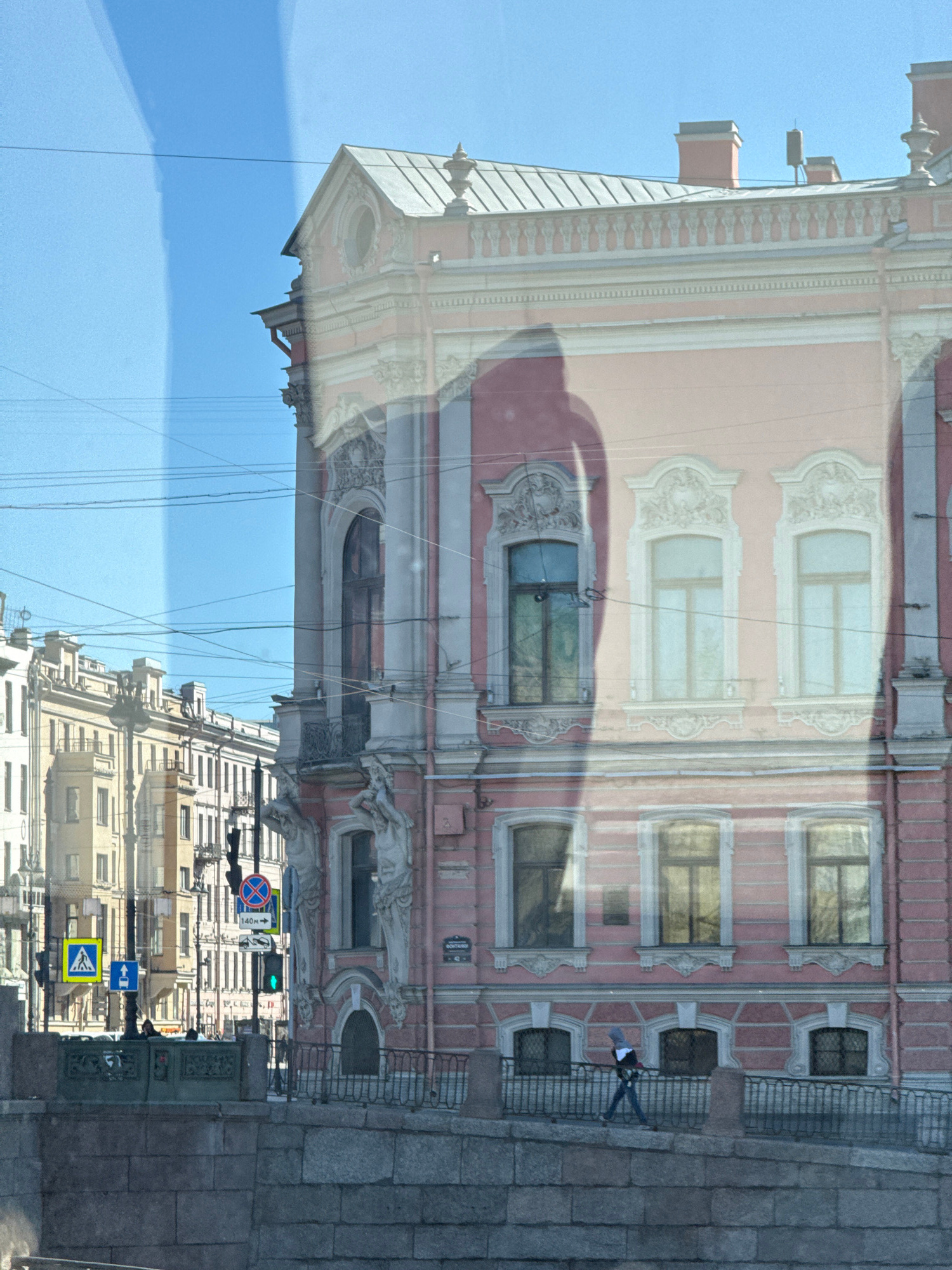 The image shows a reflection of a building in Saint Petersburg, Russia, in a window. The building is light pink with white trim and ornate window detailing. A pedestrian is standing on a stone walkway…read more