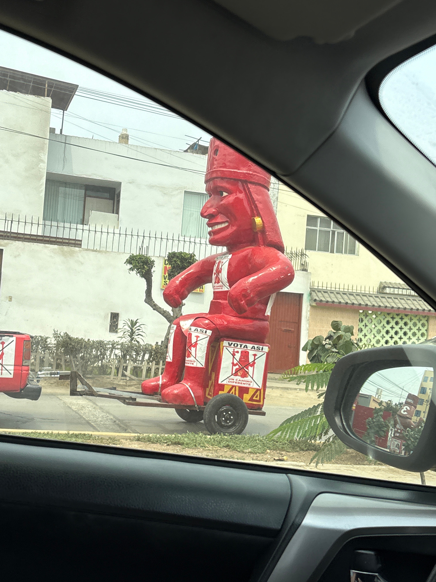 The image, taken from inside a vehicle, shows an anthropomorphic red figure affixed to a wheeled trailer, on a street in what appears to be La Perla, Peru. The figure, characterized by exaggerated fea…read more