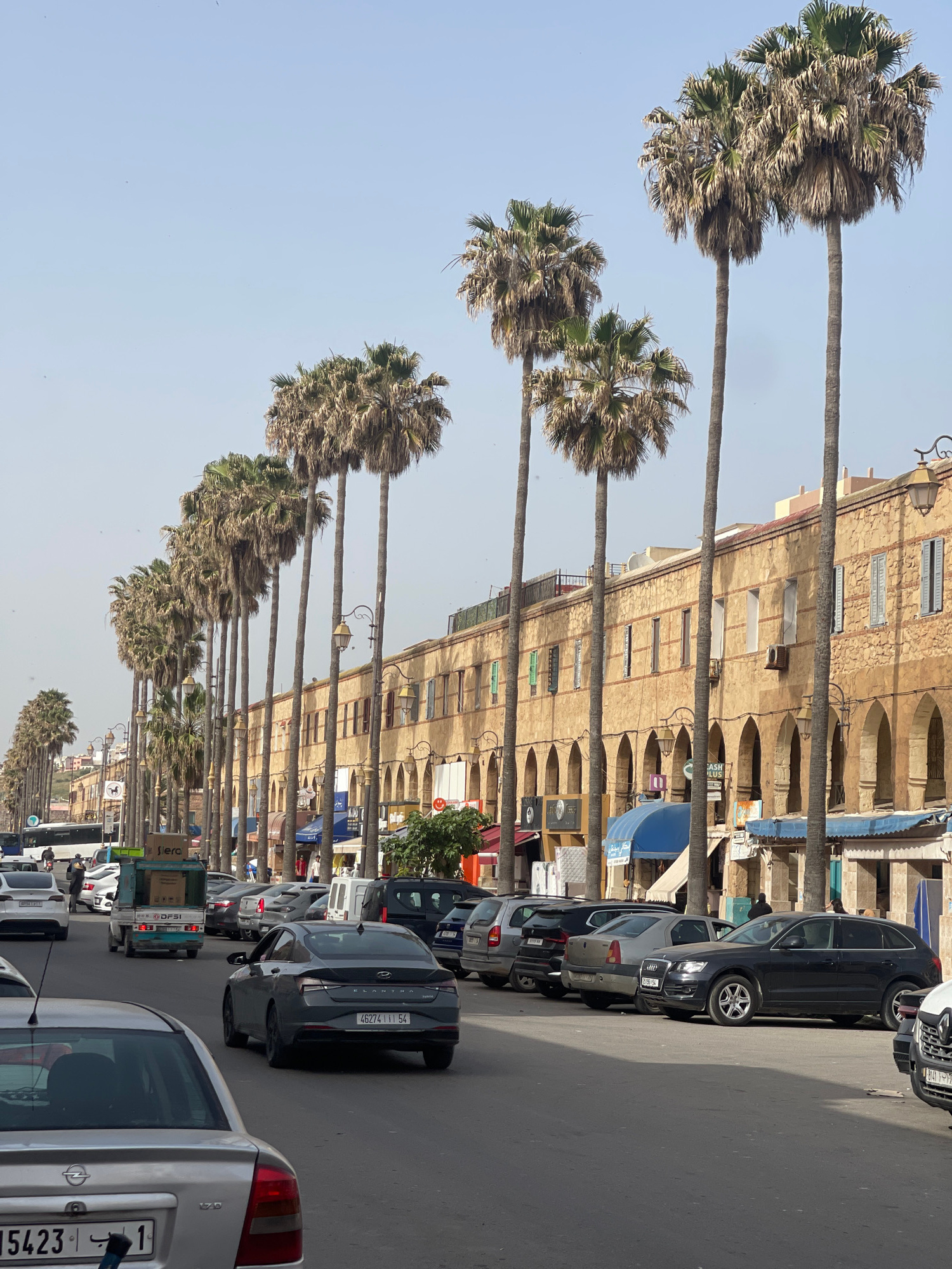 This image depicts a street in Safi, Morocco, lined with tall palm trees on one side. Alongside the trees stands a multi-story building with arched windows. Parked cars fill the street, creating dense…read more