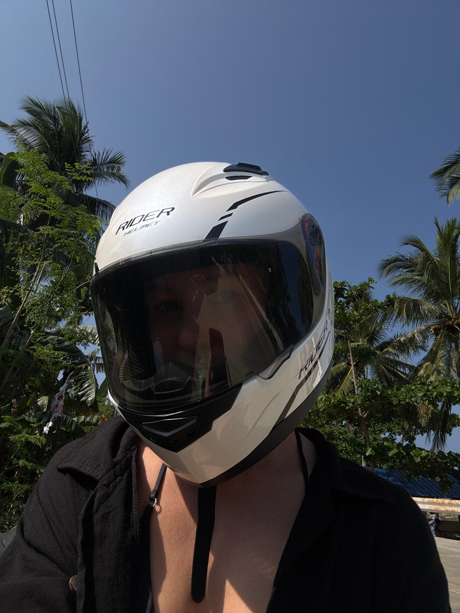 A first-person, eye-level shot shows a person wearing a white "RIDER" helmet with a dark visor against a backdrop of tropical foliage and a clear blue sky in General Luna, Philippines. Palm trees are…read more