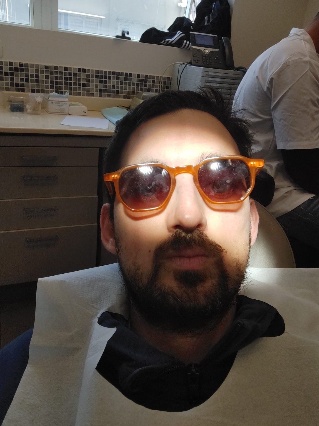 A man with a beard is lying on a medical examination table in an office setting in Tel Aviv, Israel. He is wearing orange sunglasses. The office has a window showing buildings outside. There is medica…read more