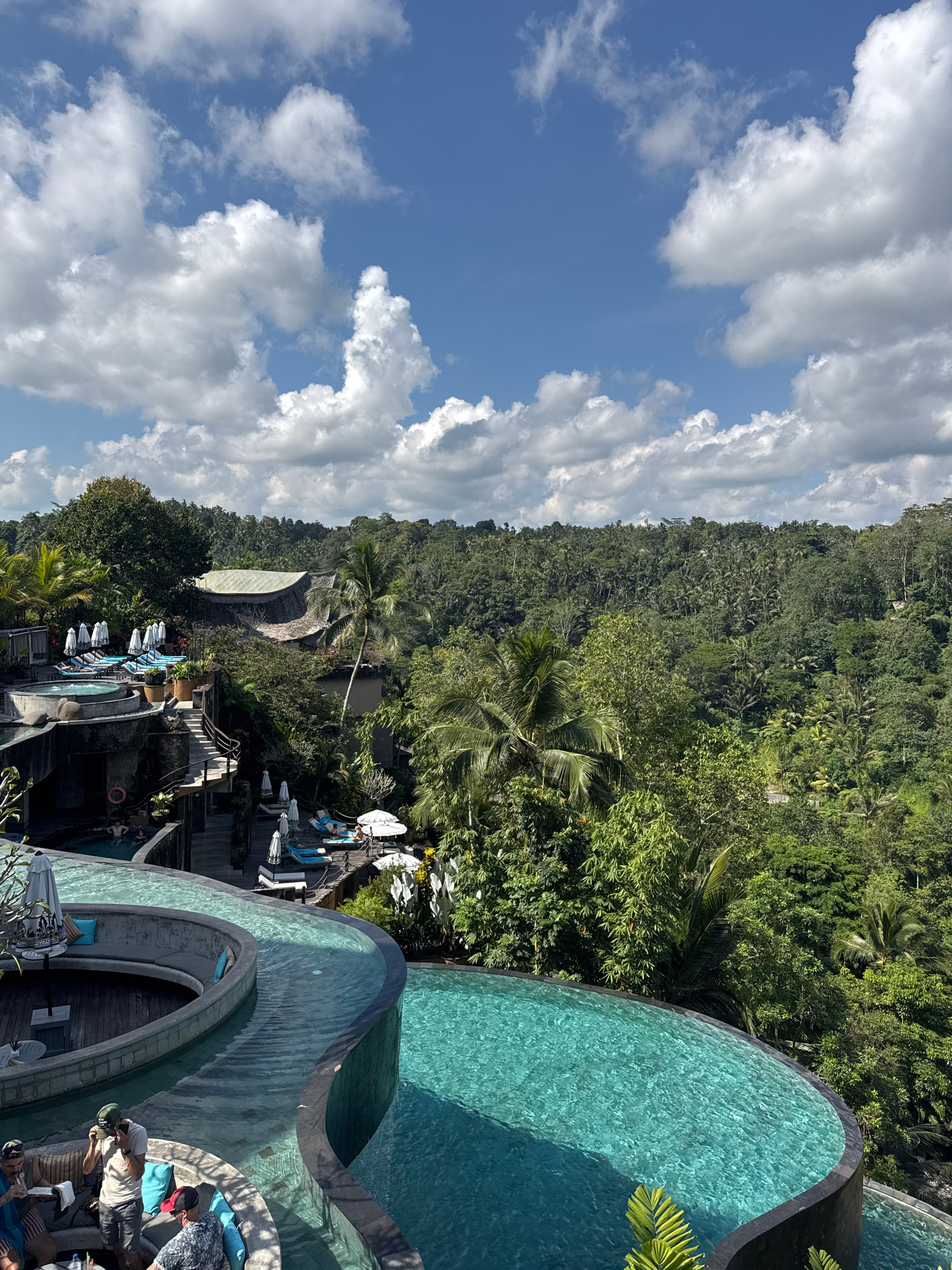 The image depicts a tropical resort setting in Payangan, Indonesia. The scene is shot from an elevated perspective, showcasing an infinity pool with turquoise water that curves along the edge of a lus…read more