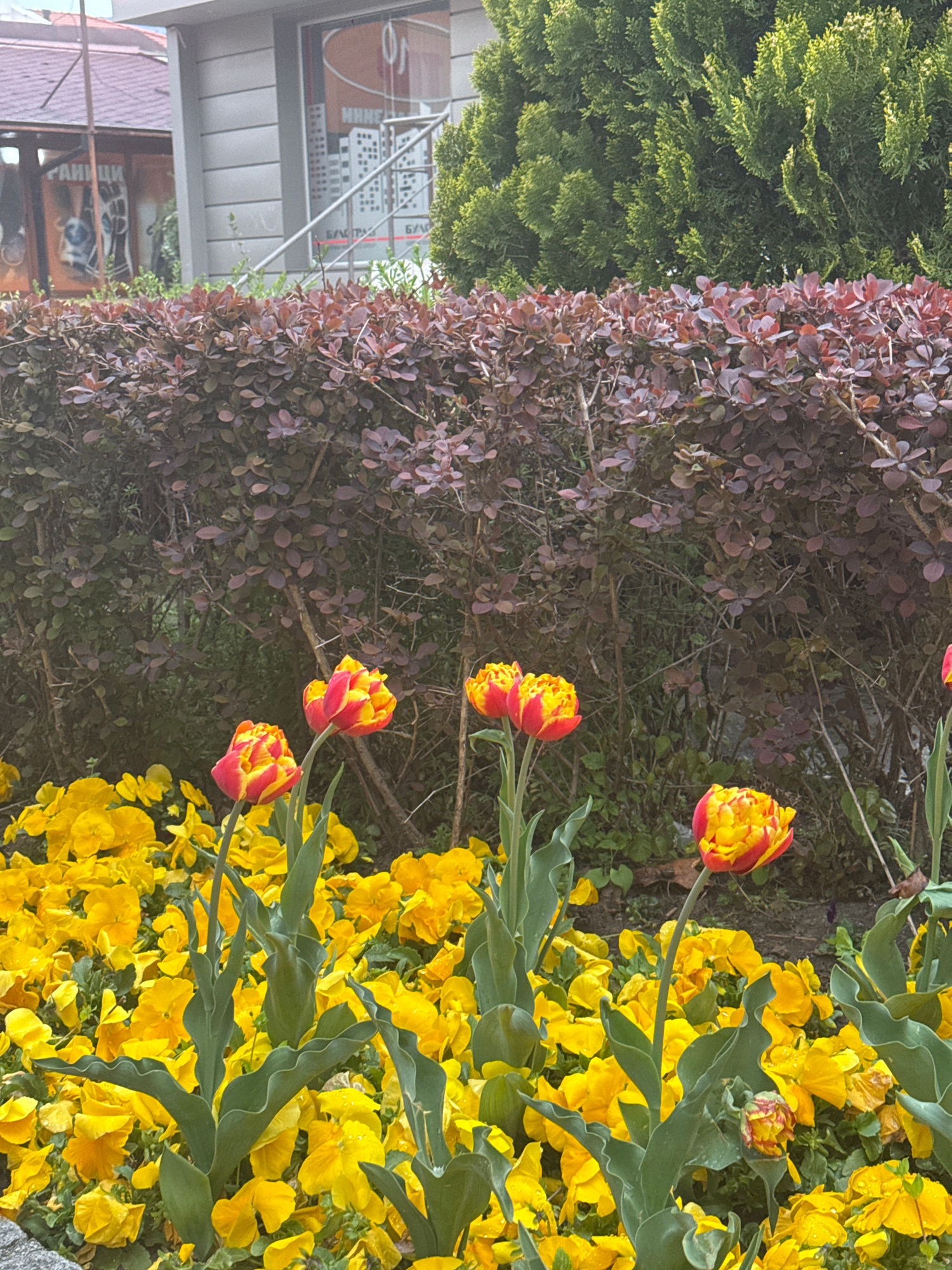 The image displays a vibrant outdoor scene dominated by various plants. On the far left, a dense hedge of green coniferous bushes forms a vertical band. Adjacent to it, towards the center, is another…read more