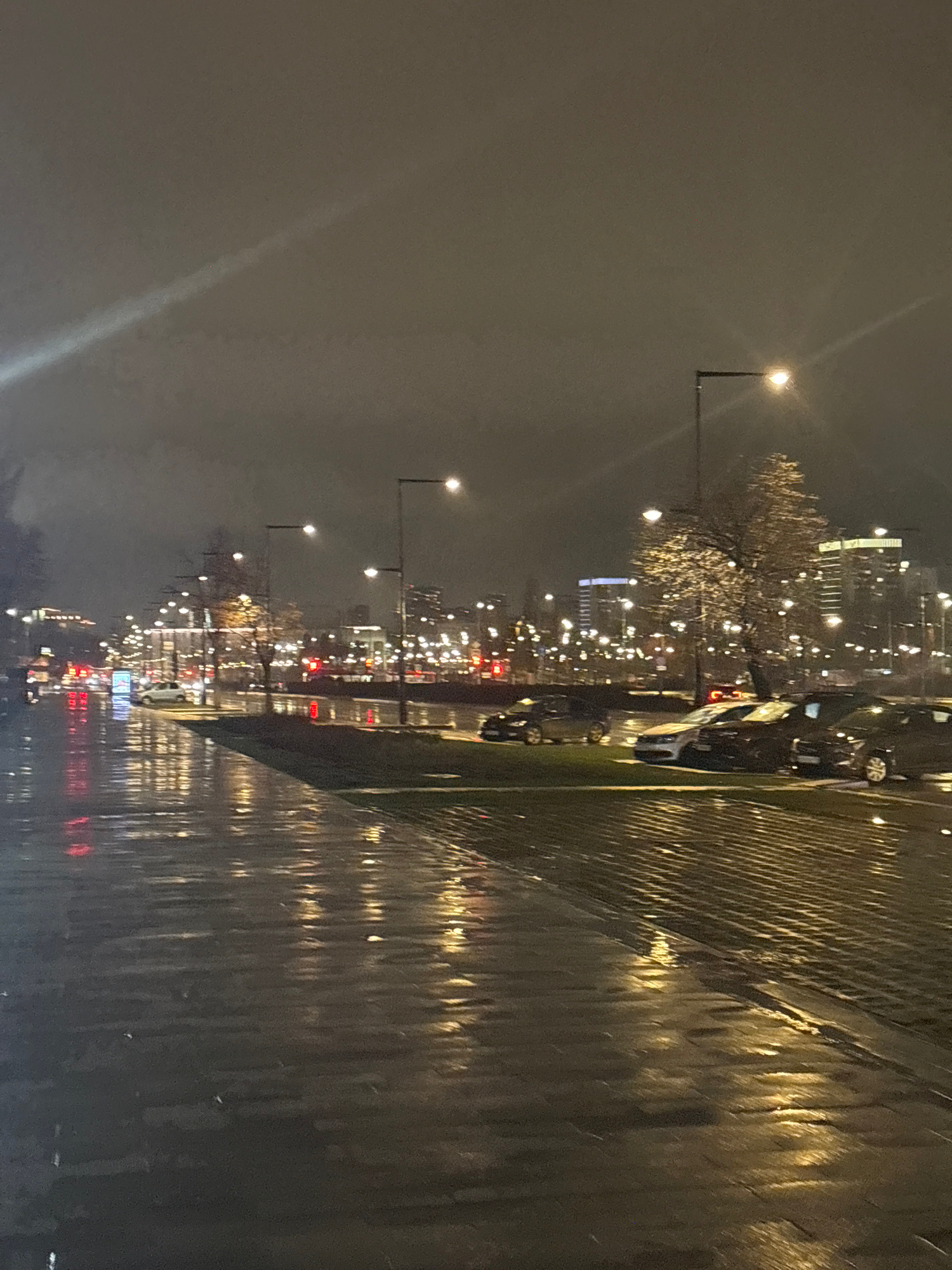 The image depicts a rainy night scene on a street in Perm, Russia. Streetlights illuminate the wet pavement, reflecting the city lights. Parked cars are visible along the curb. The atmosphere suggests…read more