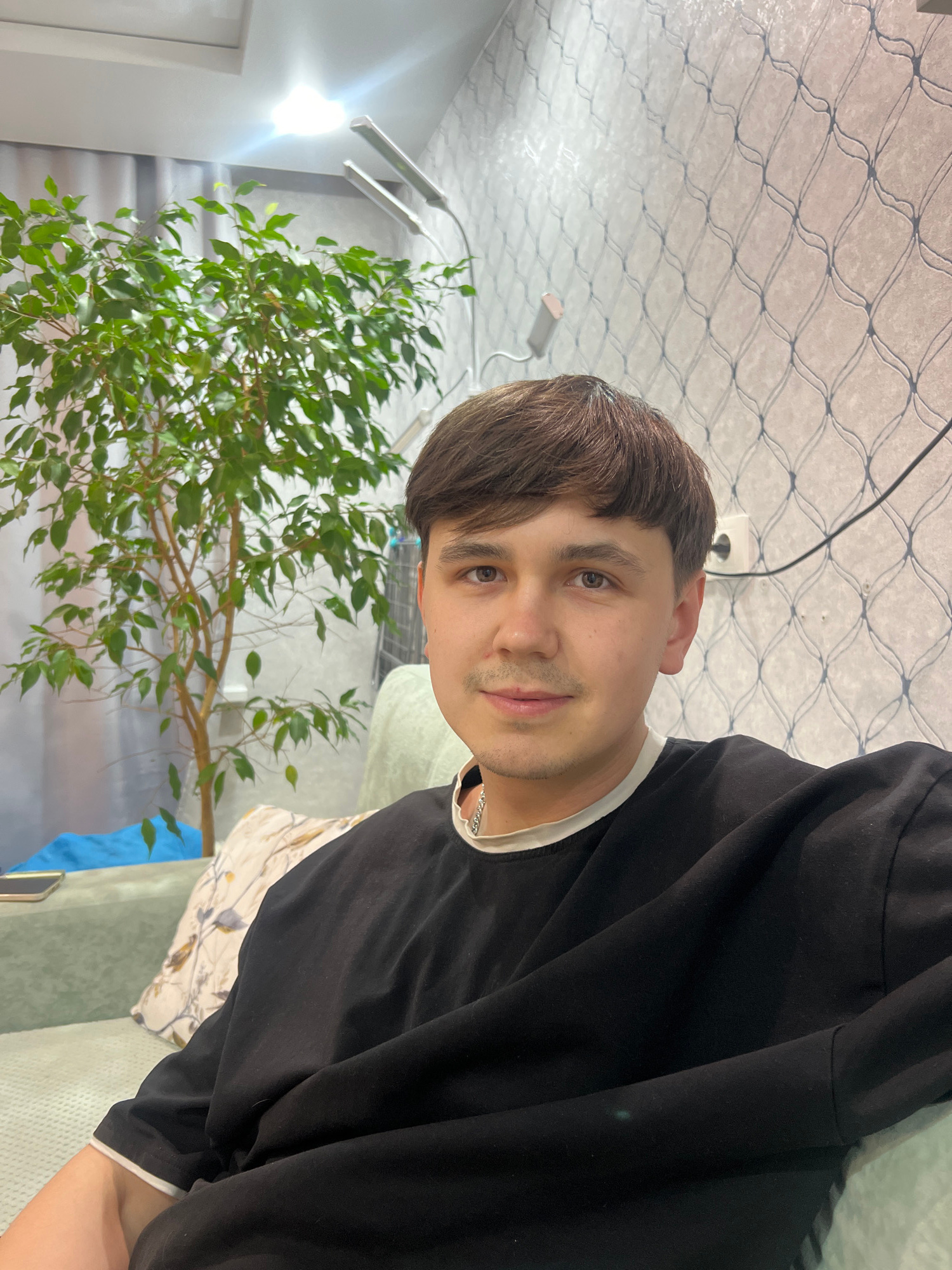 A person wearing a black long-sleeve shirt and a white undershirt is in an indoor setting, possibly a room in a home or office. The person has brown hair and light skin. In the background, there is a…read more