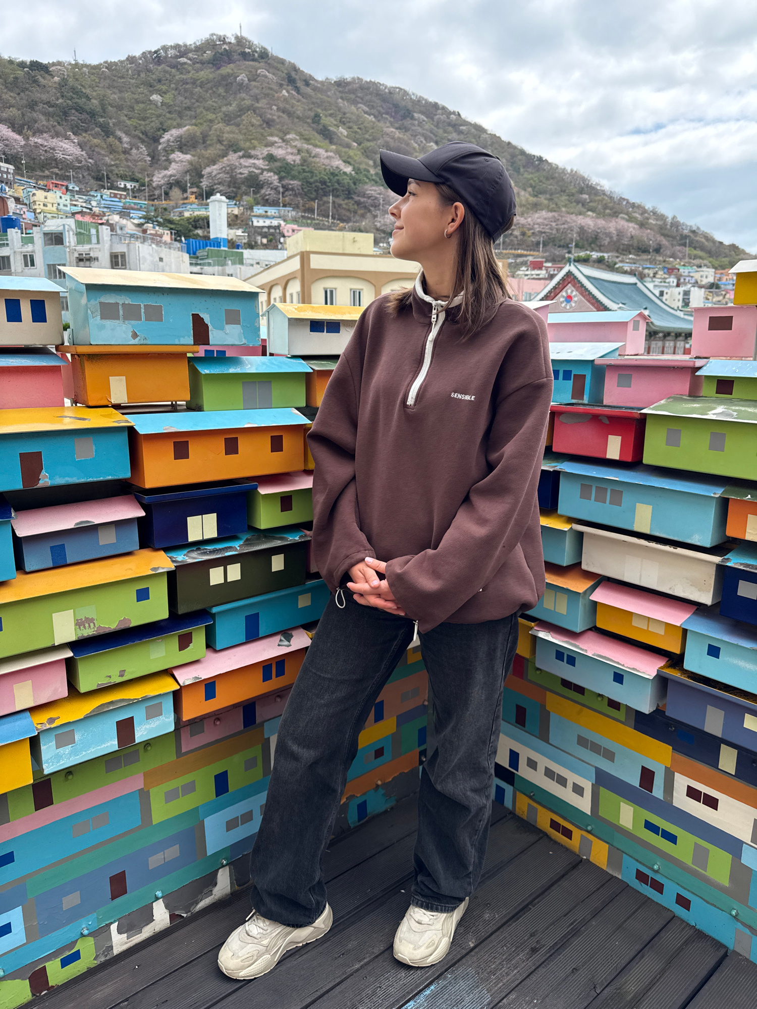 A young adult stands alongside a colorful installation resembling stacked houses. The person is wearing a brown sweatshirt, dark jeans, and white sneakers, and a black baseball cap. A mountain covered…read more