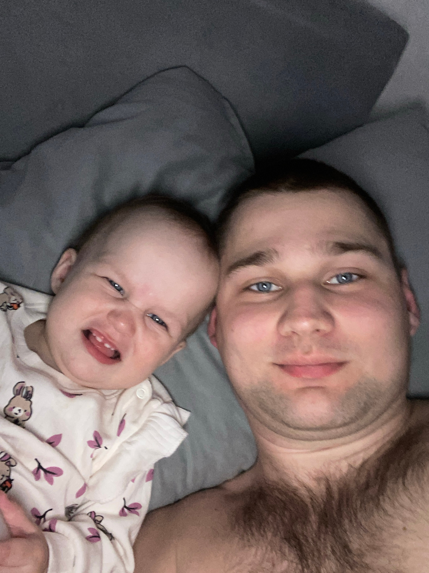A photo captures a man and a baby lying down on what appears to be a grey pillow. The man is fair-skinned with short dark hair and blue eyes. He has facial stubble and chest hair is visible. The baby…read more