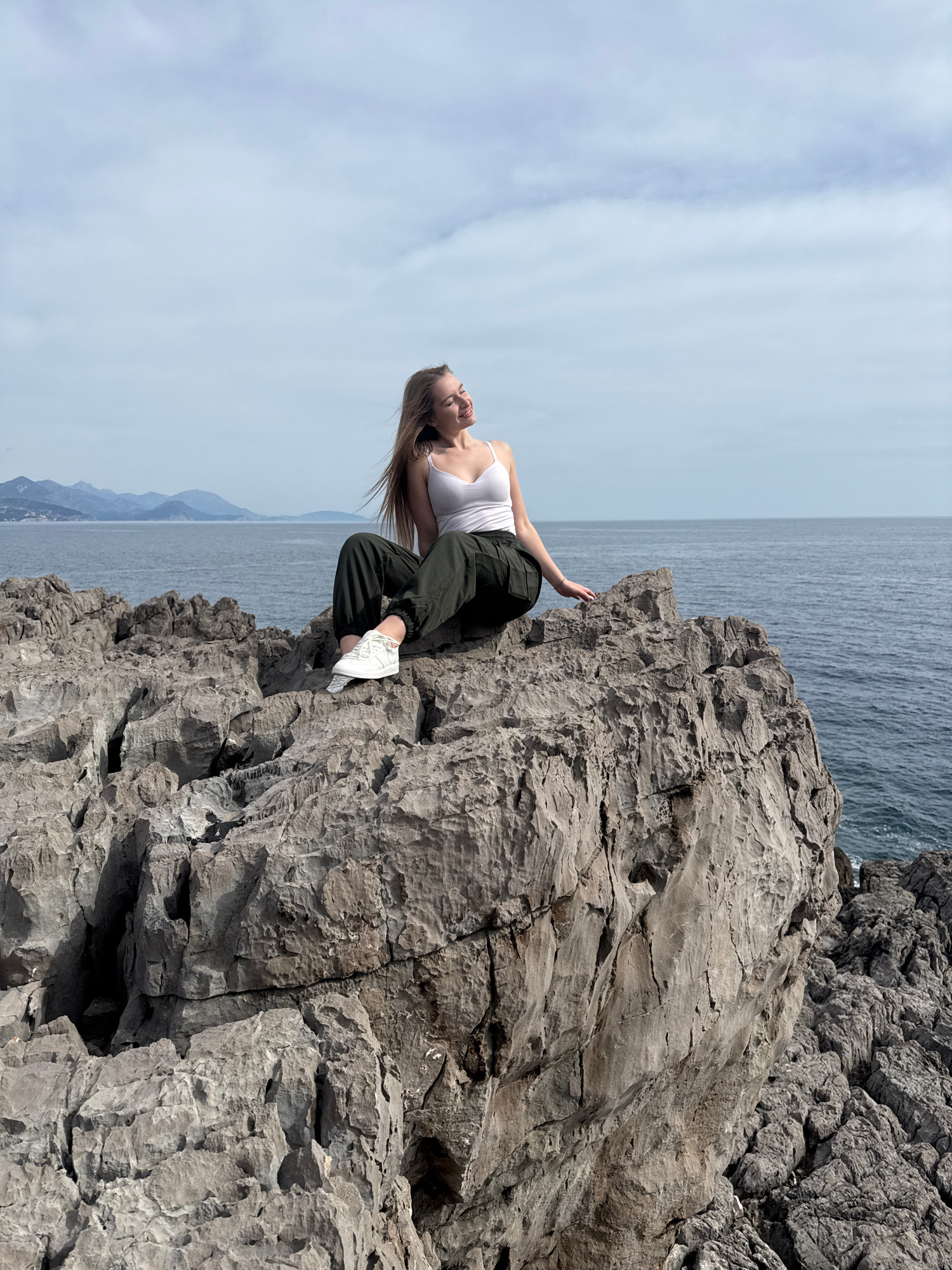 A woman is posing on a rocky cliff in Boreti, Montenegro. She is wearing a white tank top, dark green pants, and white sneakers. The cliff is gray and textured, with the Adriatic Sea and coastline vis…read more