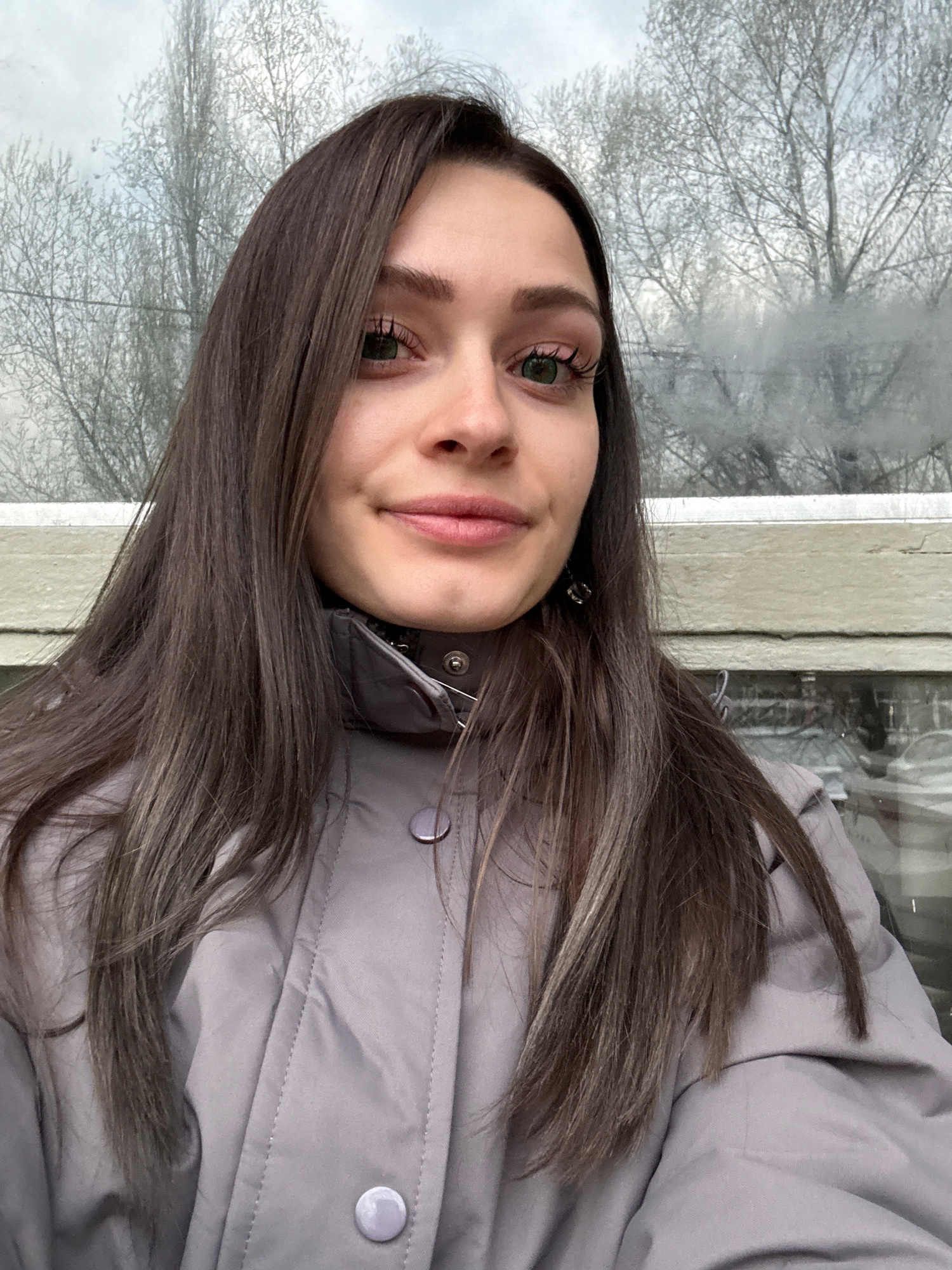 A woman with long brown hair and light skin is facing the camera. She is wearing a gray puffer jacket with metallic buttons. The background features bare trees against a gray sky, visible through what…read more