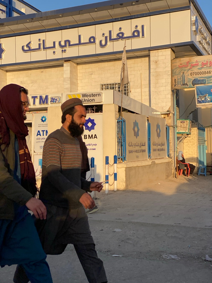 An image taken in Kandahar, Afghanistan, depicts a street scene with a bank and adjacent commercial establishments under clear daylight. The main structure is the Afghan Milli Bank (افغان ملي بانک), i…read more