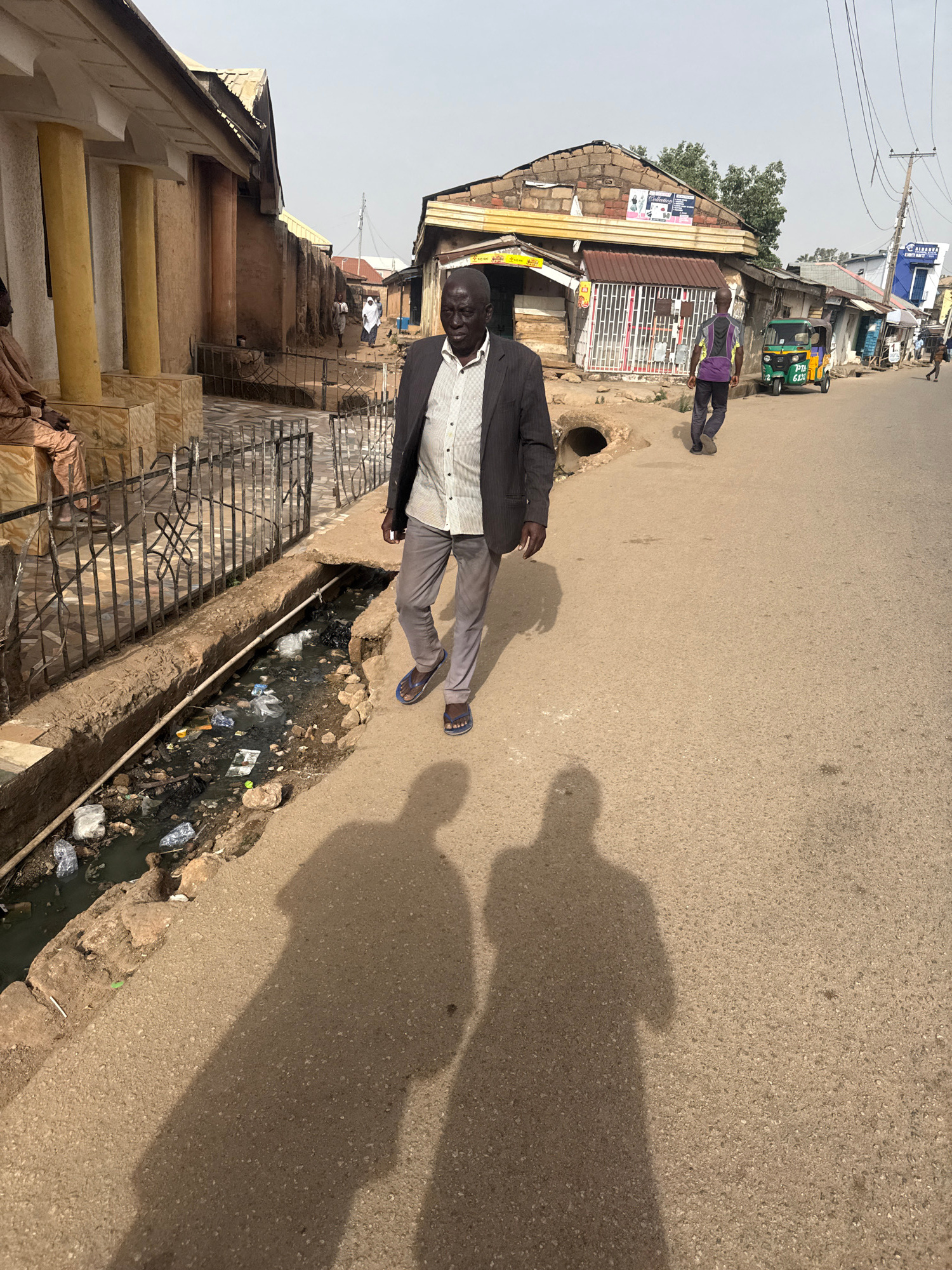 An adult male wearing a black coat, white shirt, and gray pants is walking on a paved road in Jos, Nigeria. The environment includes buildings, a drainage ditch filled with trash, and other people fur…read more