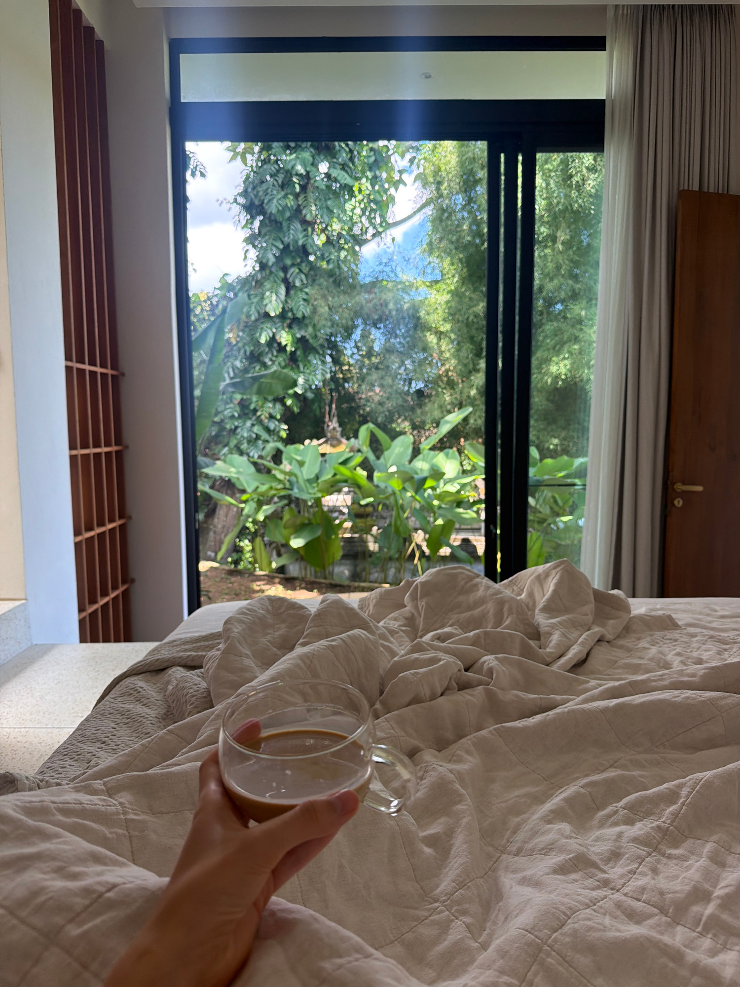 A medium shot captures a person's hand holding a glass cup containing a beige-colored liquid (likely a drink) while lying in bed. The bed has a wrinkled, light beige, quilted duvet. Outside the window…read more