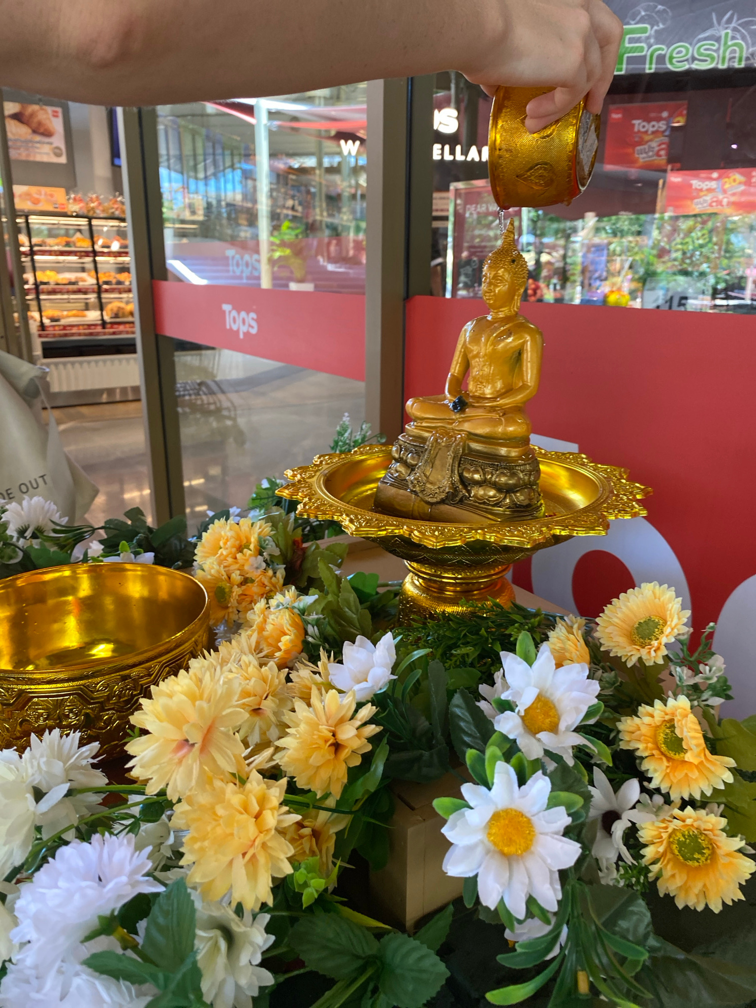 A photograph taken indoors in Choeng Thale, Thailand, shows a golden Buddha statue sitting on an ornate golden stand and surrounded by yellow and white flowers. A person's arm and hand hold a golden b…read more