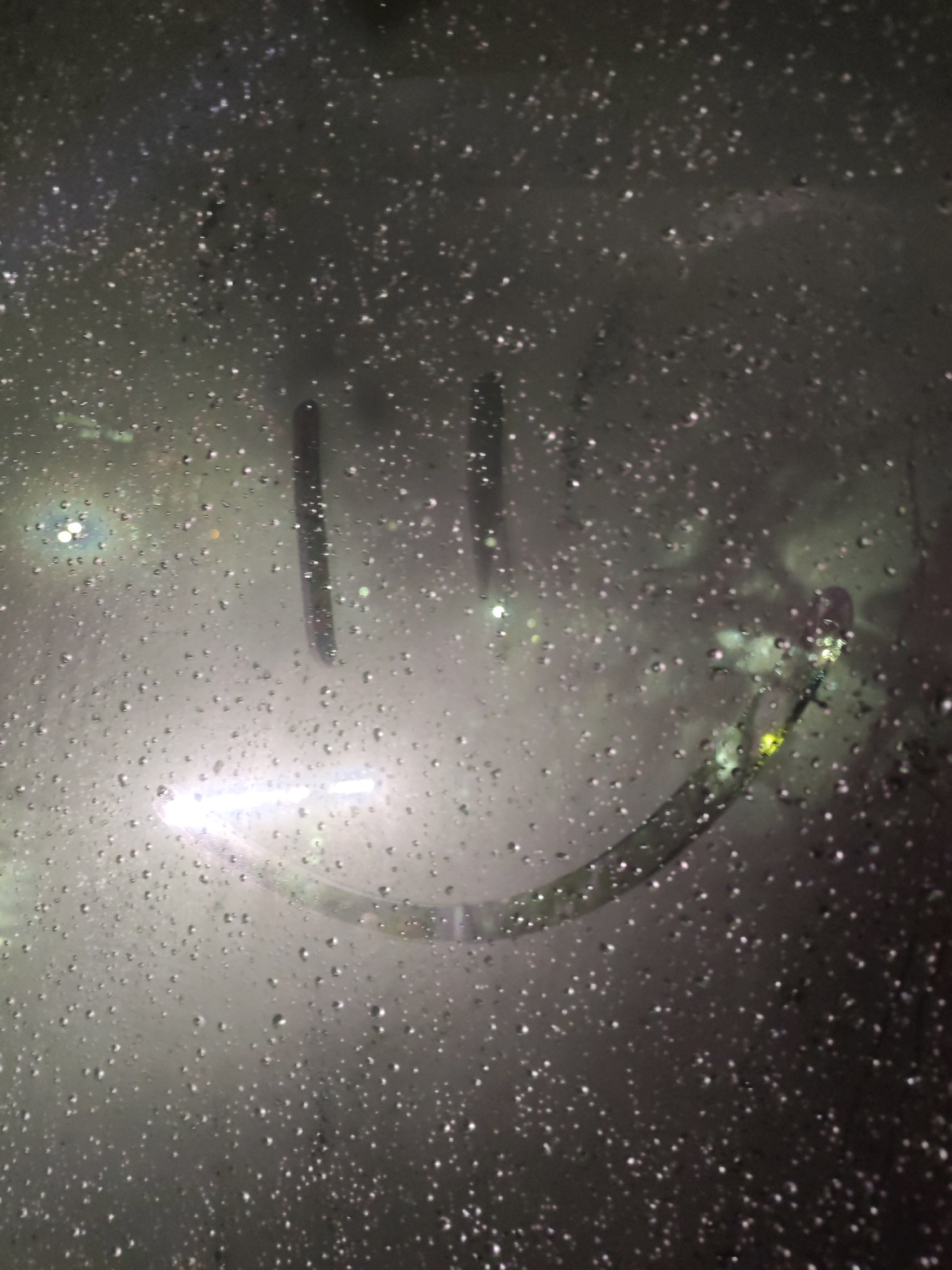 The image captures a close-up view through a pane of glass, which is heavily covered in water droplets and condensation. A distinct smiley face has been drawn onto this wet surface, with its two oval…read more