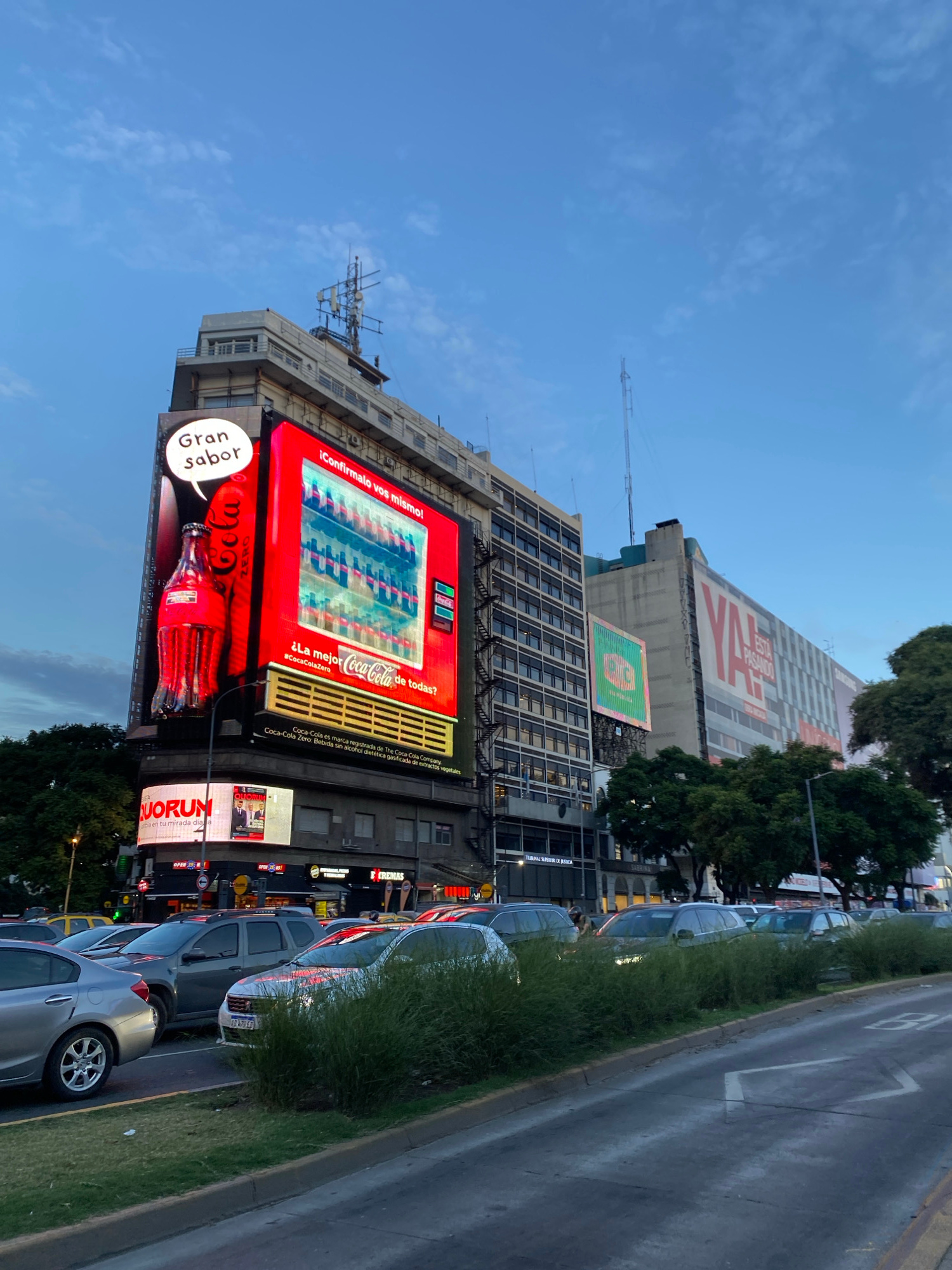 The image shows a street scene in Buenos Aires, Argentina, dominated by a building with a large Coca-Cola advertisement displayed on its facade. The ad features the phrase "Gran Sabor" (Great Flavor)…read more
