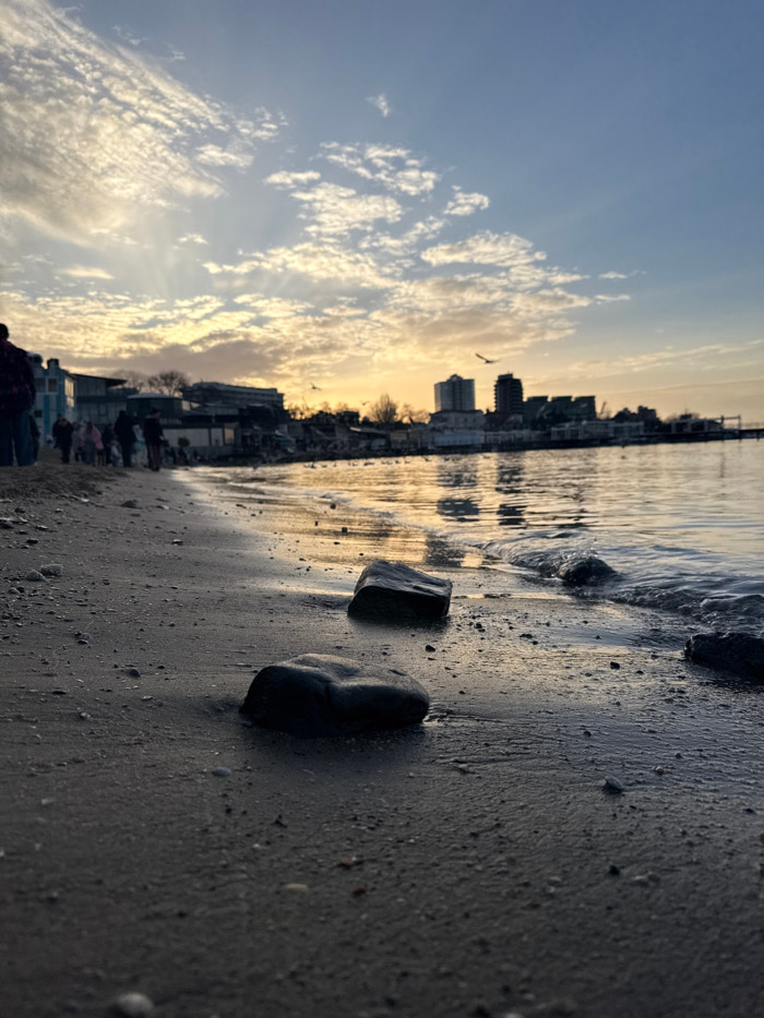 The image depicts a coastal scene in Anapa, Russia, during twilight conditions, indicative of either sunrise or sunset. The foreground displays dark, wet sand containing small pebbles. Two prominent d…read more
