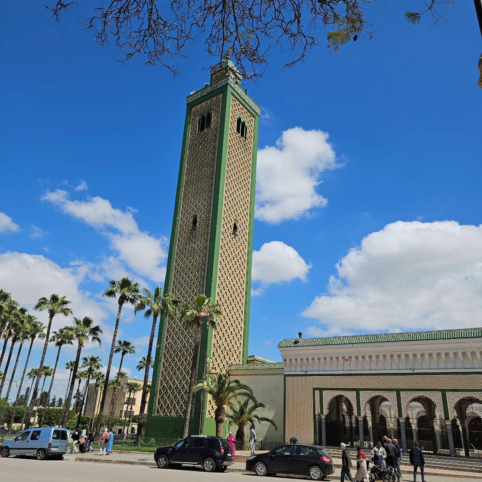 The image shows a tall, rectangular minaret in Fez, Morocco, under a bright blue sky with scattered white clouds. The minaret has a green border and a detailed geometric pattern in a lighter shade, po…read more