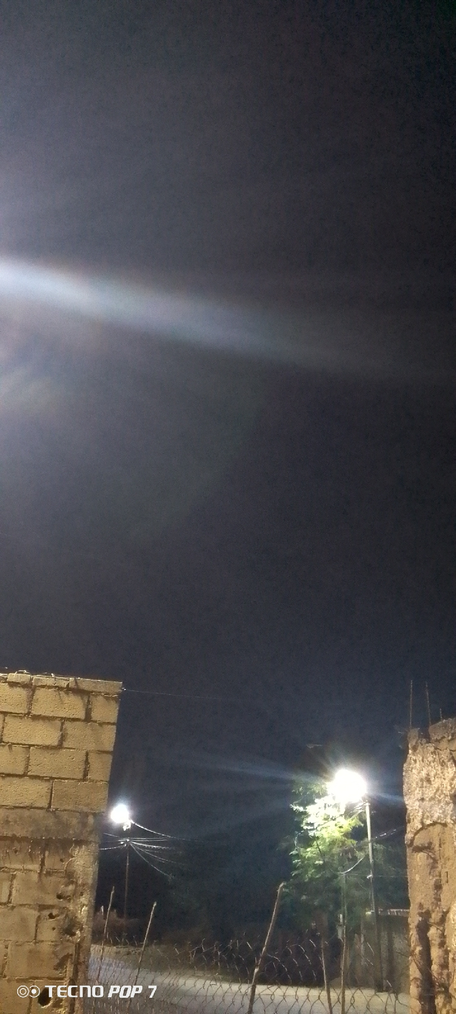 The image depicts a nighttime scene in Altagracia, Venezuela. In the foreground, there is a chain-link fence. Behind the fence, there are two walls constructed from stone and cinder blocks. Streetligh…read more