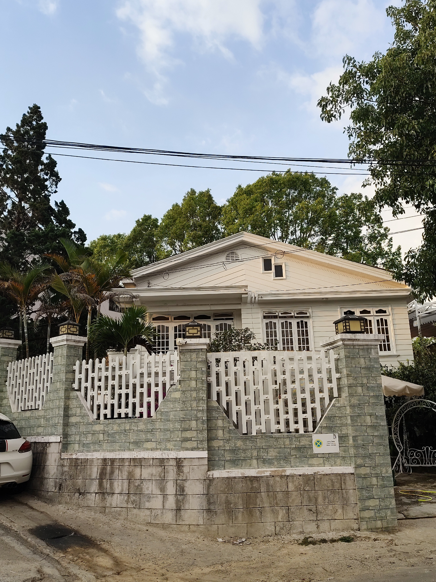 A daytime exterior shot reveals a white, single-story house with a triangular gable roof, observed behind a low stone and white picket fence. The house features multiple windows with white frames, a sā¦read more