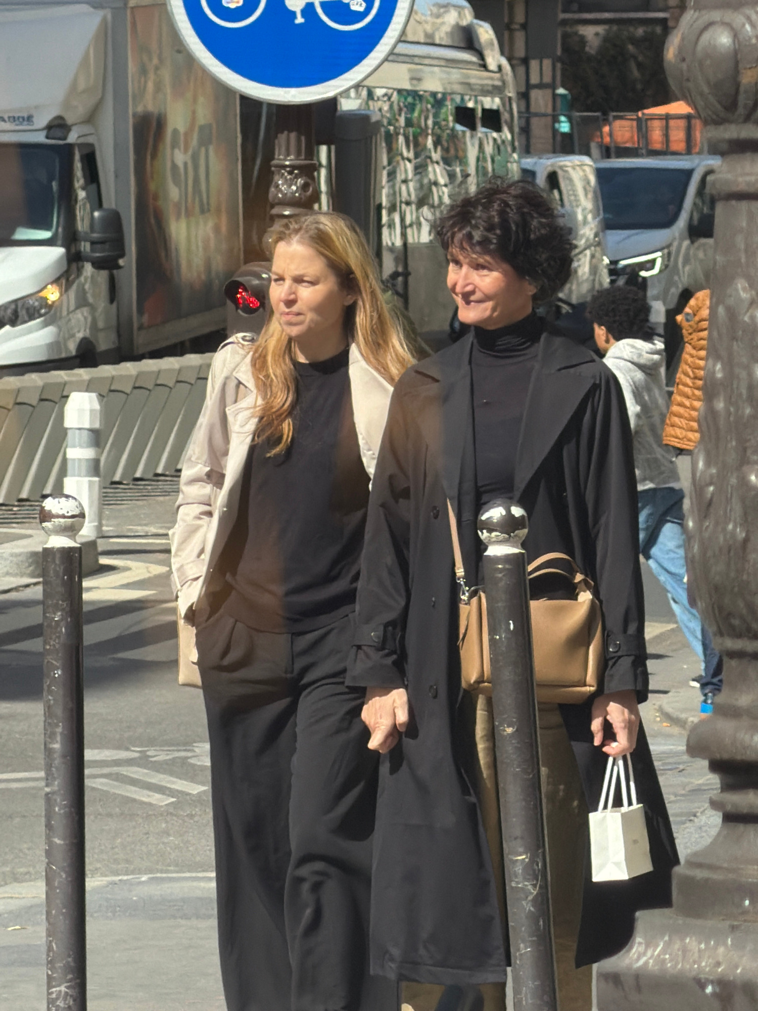 The image captures a Parisian street scene featuring two women. The first woman, with curly dark hair, is clad in a long black coat and carries a small tan handbag. She is also holding a white paper b…read more