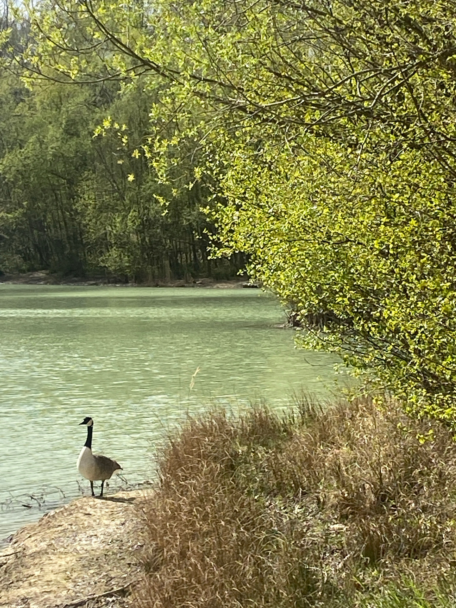 The image depicts a goose standing on a grassy bank next to a body of water. Green foliage is visible to the left, and dried vegetation to the right. The location is Saint-Martin-du-Tertre, France.